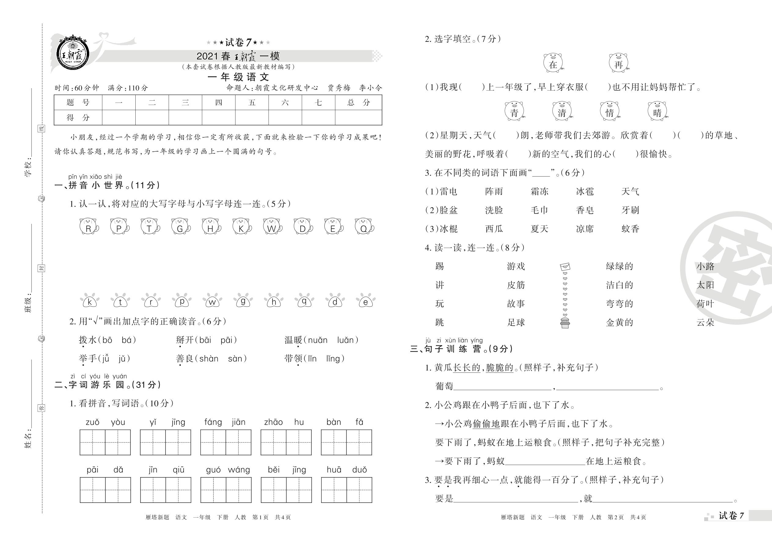 王朝霞期末模拟卷一年级下册语文(人教版)_R210731172447【7】