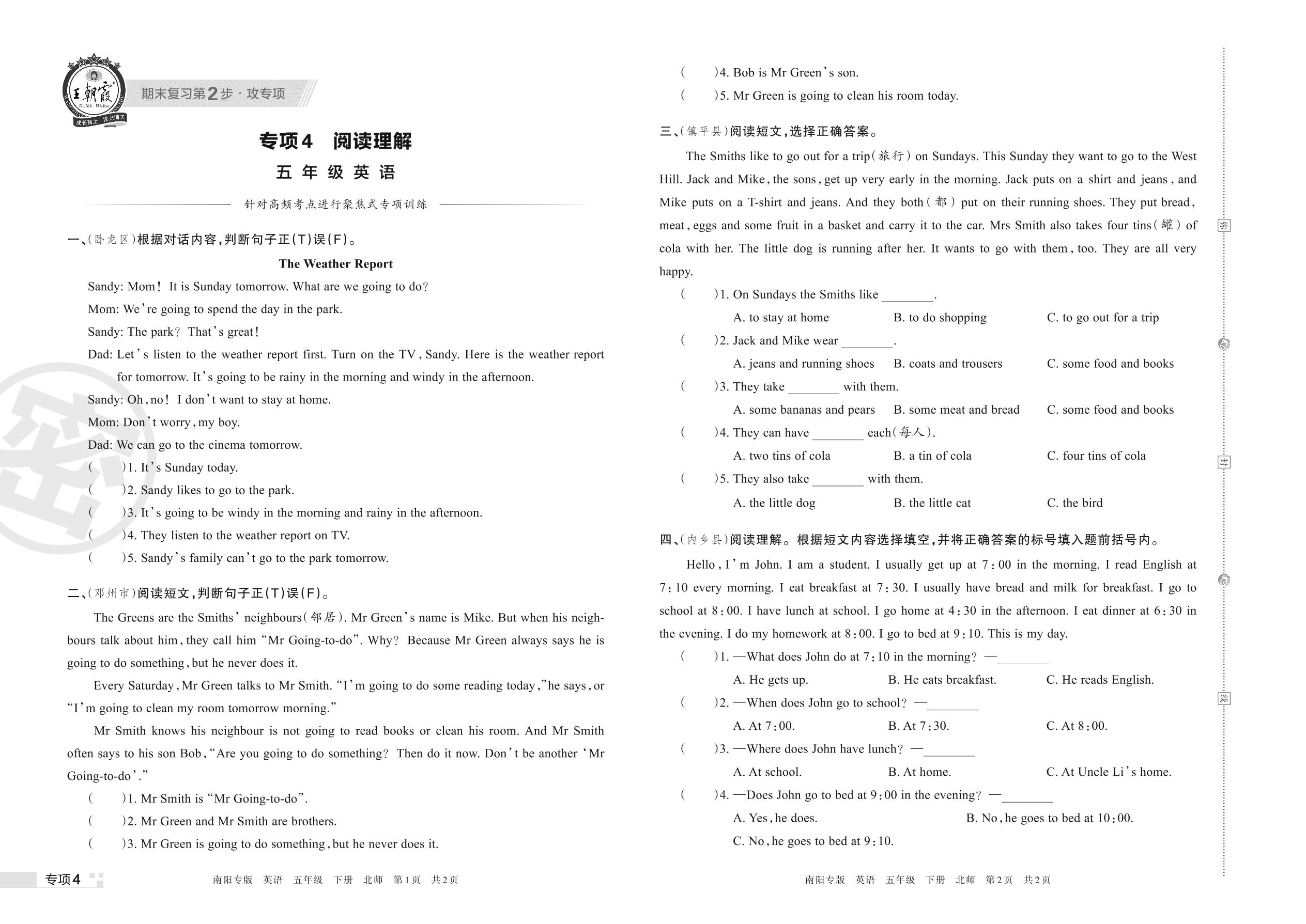 王朝霞期末专项卷——阅读理解五年级下册英语(北师版)【4】