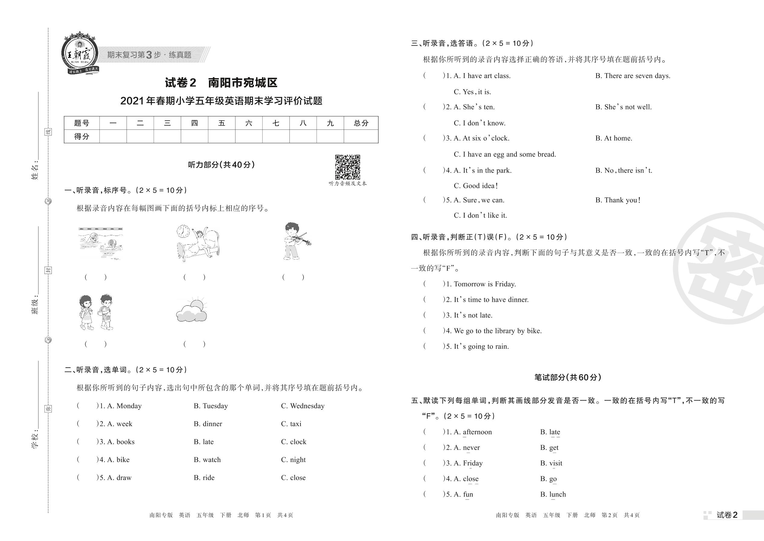 南阳市宛城区2021年春期小学五年级英语期末学习评价试题(北师版)【2】