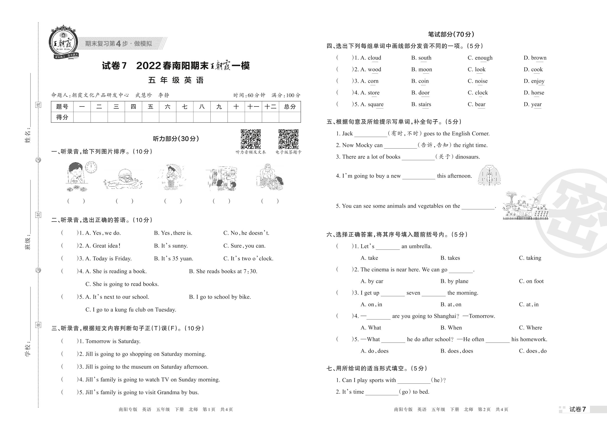 王朝霞期末模拟卷五年级下册英语(北师版)【7】
