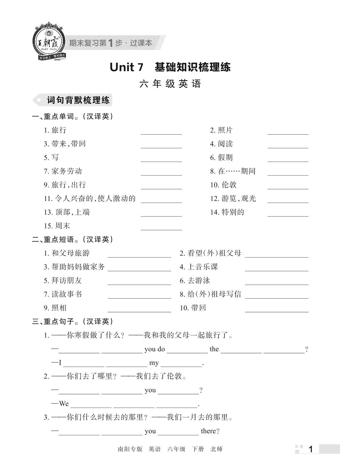 王朝霞期末过课本——Unit 7 基础知识梳理练六年级下册英语(北师版)