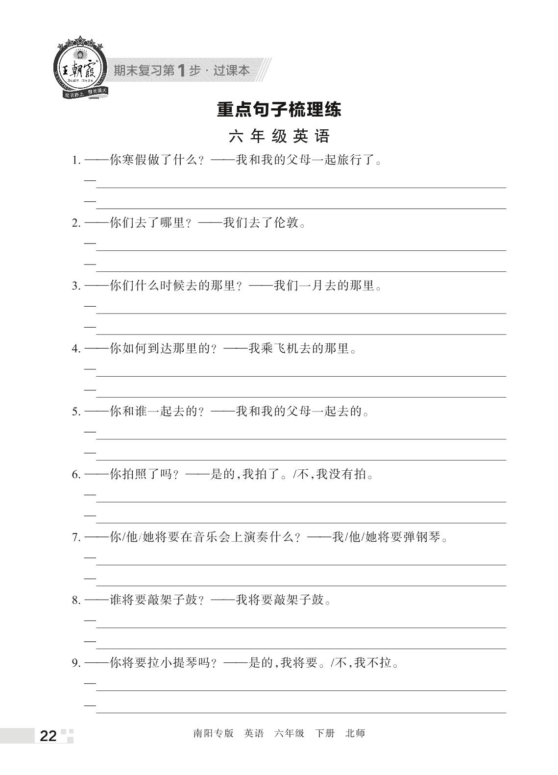 王朝霞期末过课本——重点句子梳理练六年级下册英语(北师版)