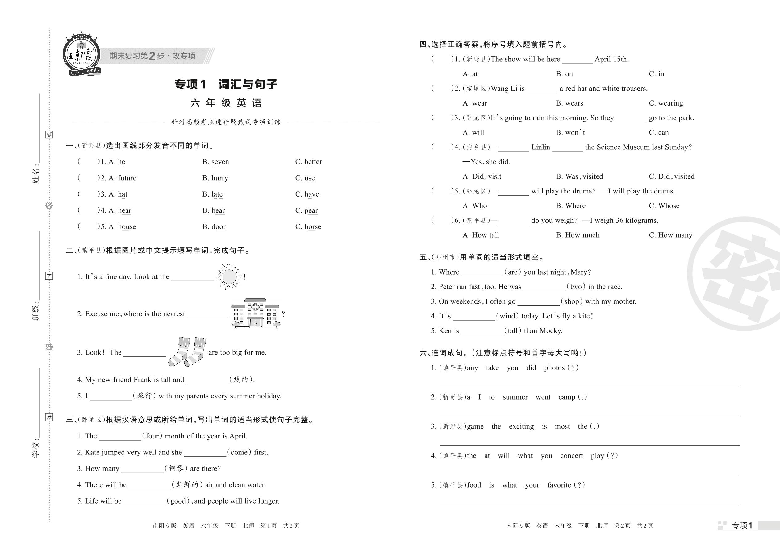 王朝霞期末专项卷——词汇与句子六年级下册英语(北师版)【1】