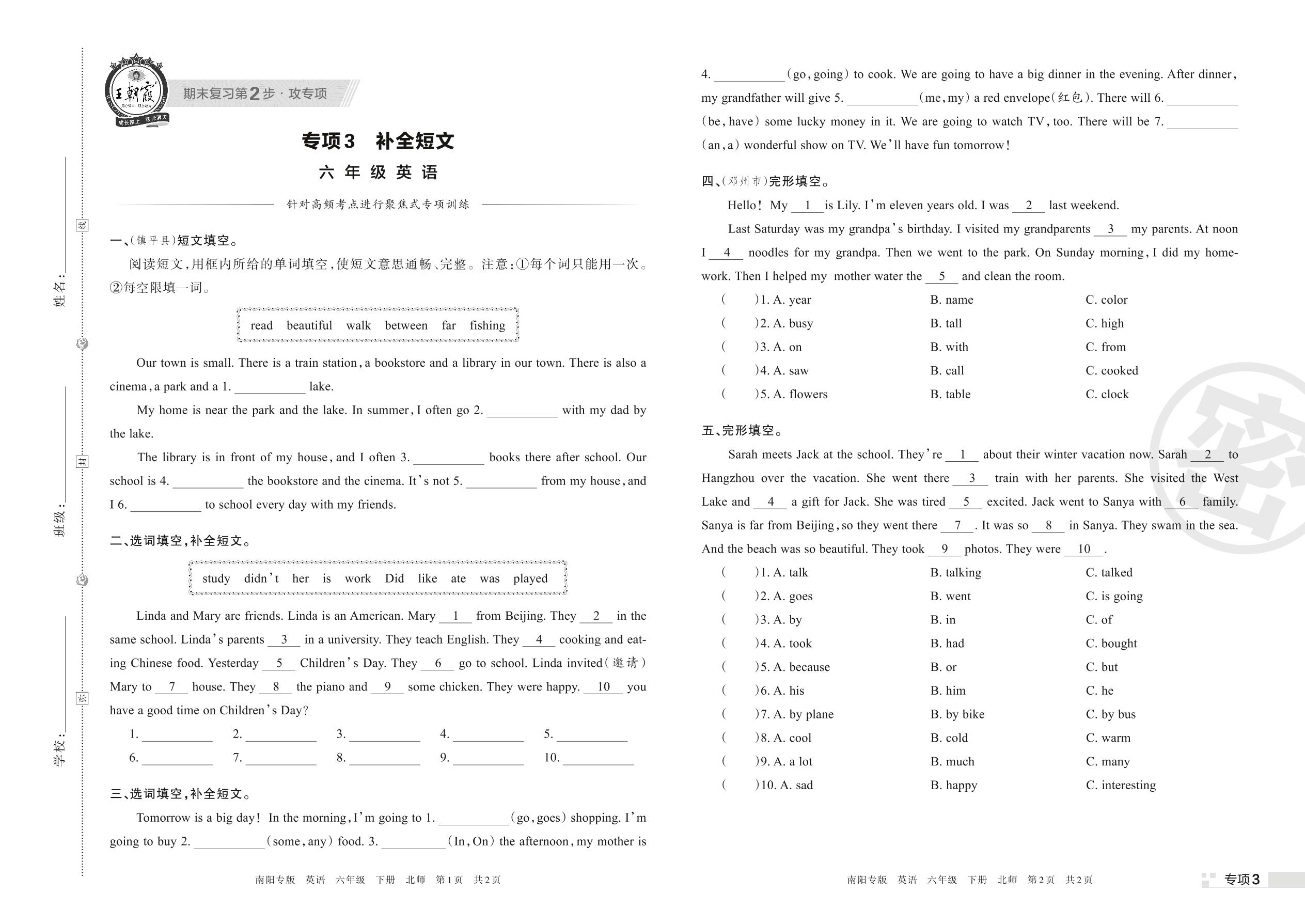 王朝霞期末专项卷——补全短文六年级下册英语(北师版)【3】