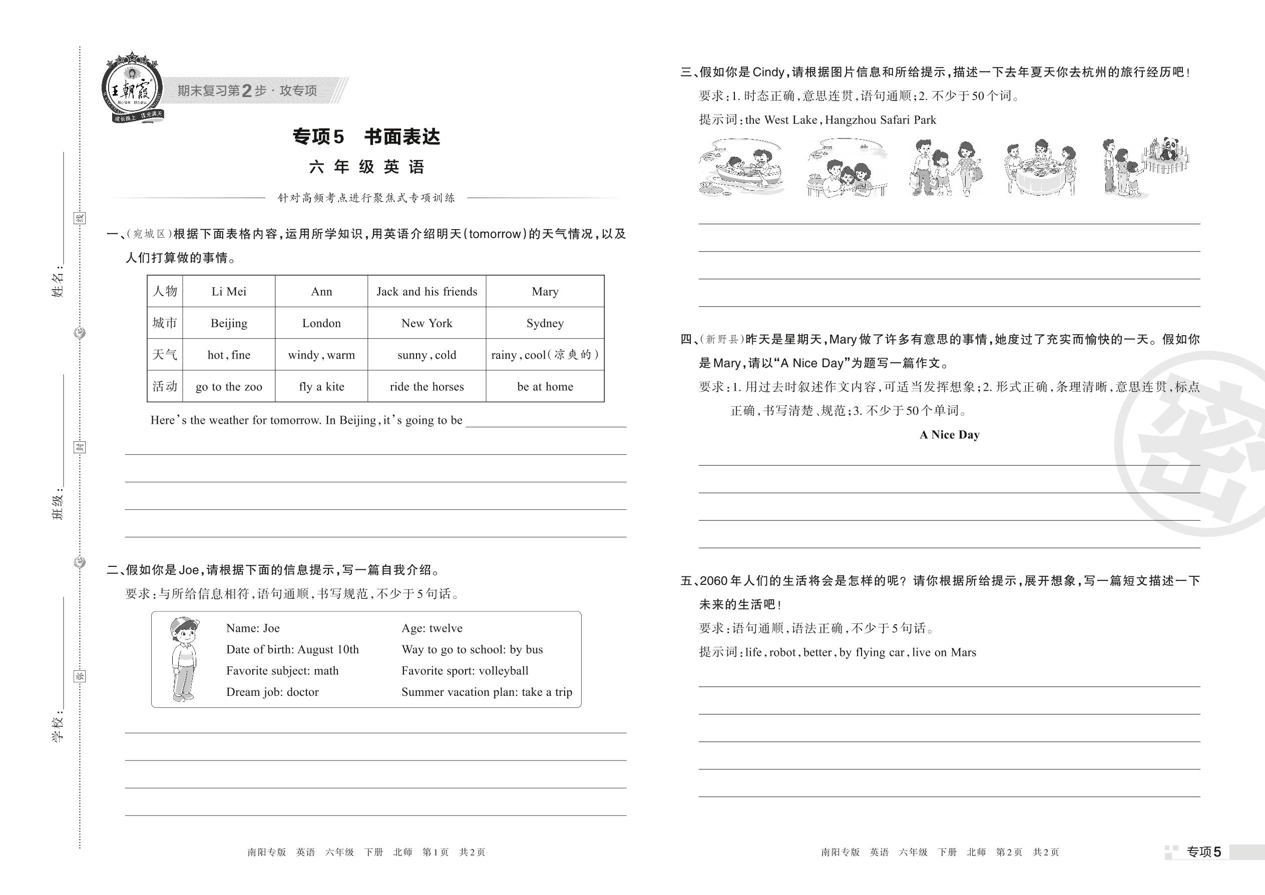 王朝霞期末专项卷——书面表达六年级下册英语(北师版)【5】