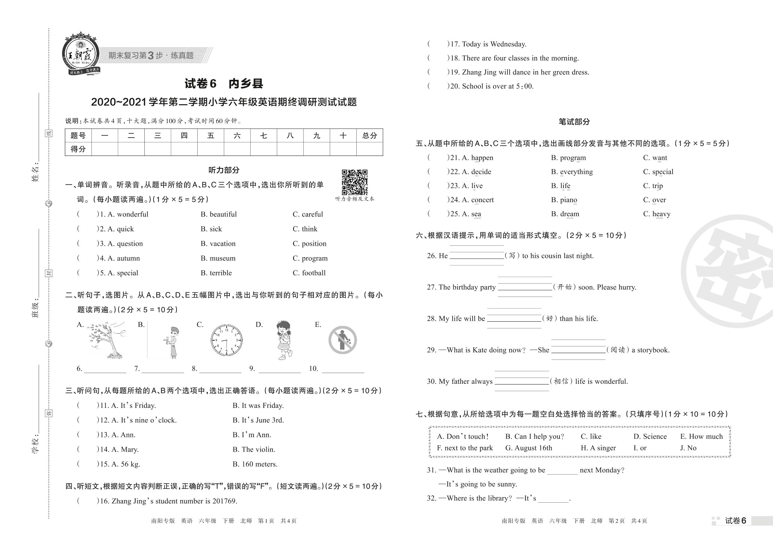 内乡县2020~2021学年第二学期小学六年级英语期终调研测试试题(北师版)【6】
