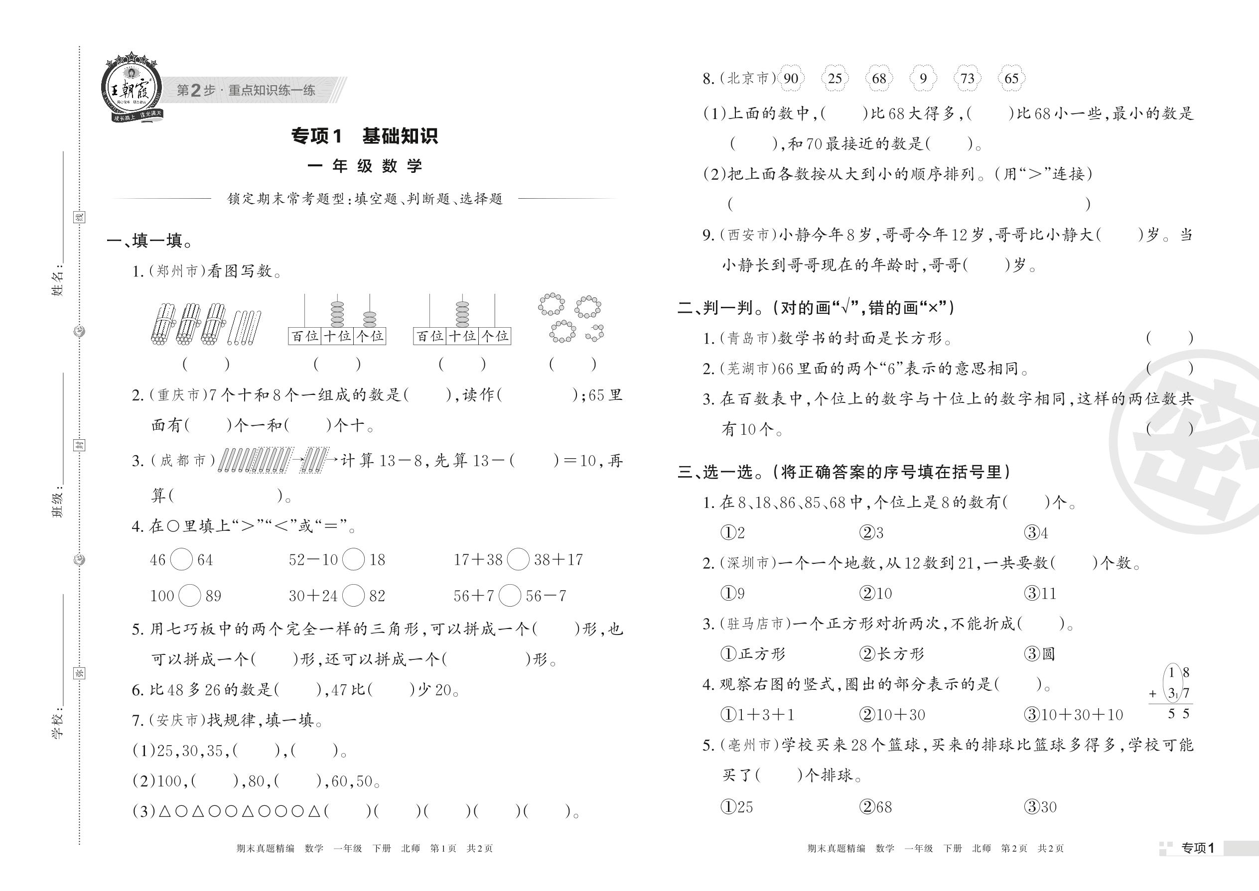 王朝霞期末专项卷——基础知识一年级下册数学(北师版)【1】