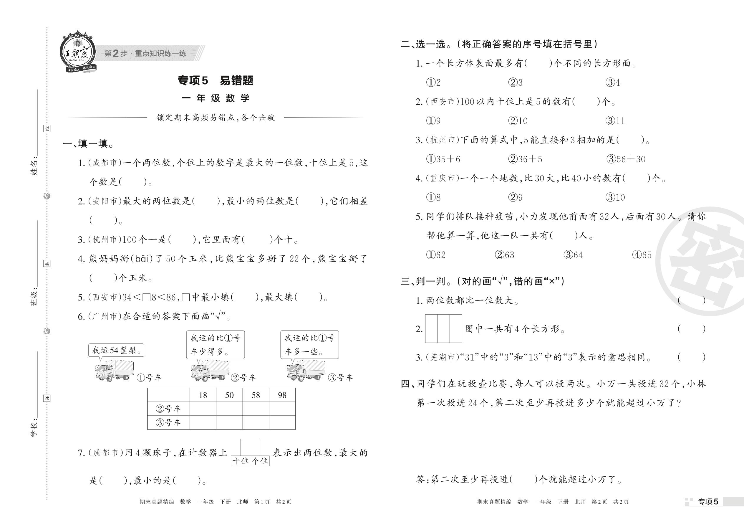 王朝霞期末专项卷——易错题一年级下册数学(北师版)_R220411140535671【5】