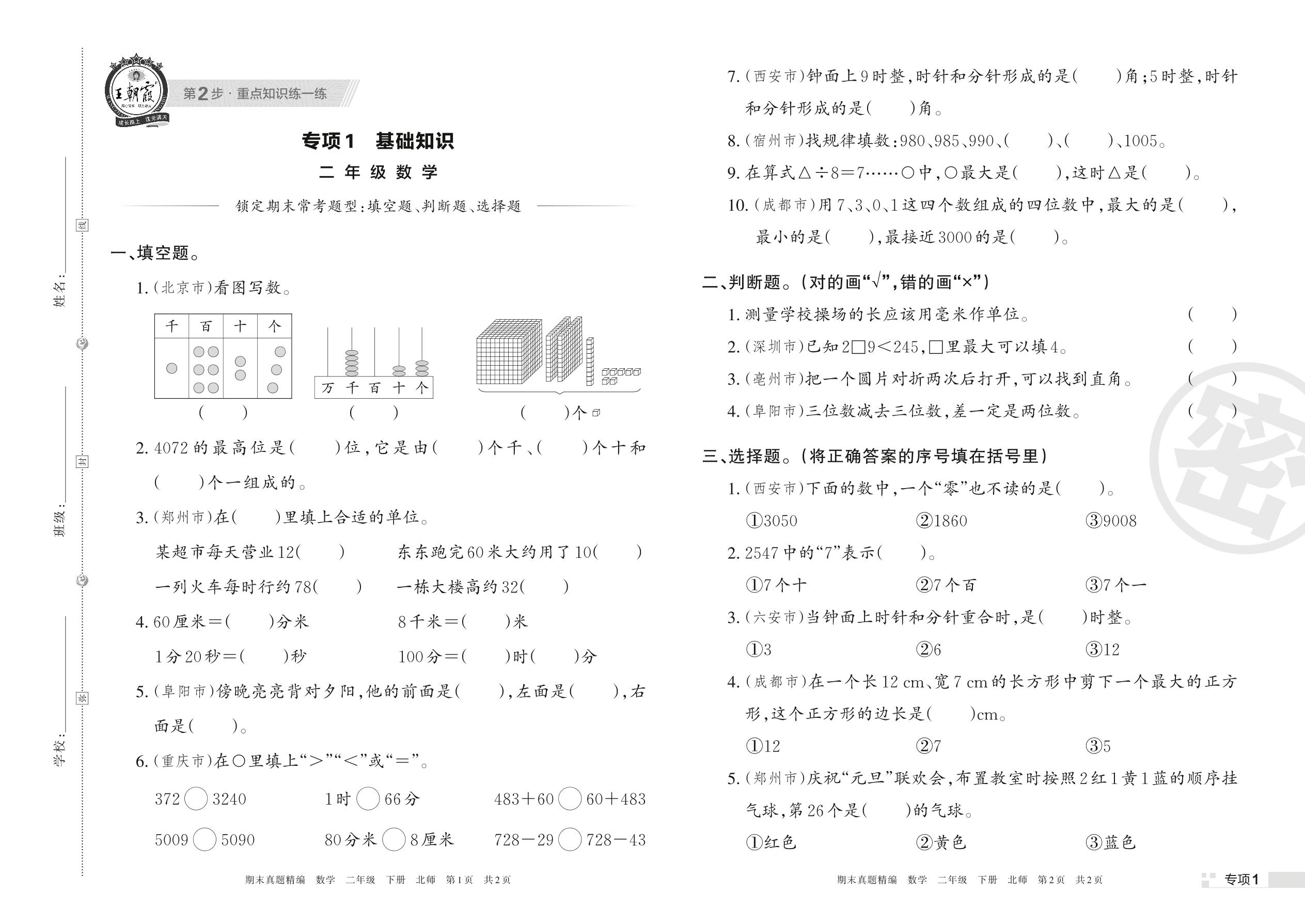 王朝霞期末专项卷——基础知识二年级下册数学(北师版)【1】