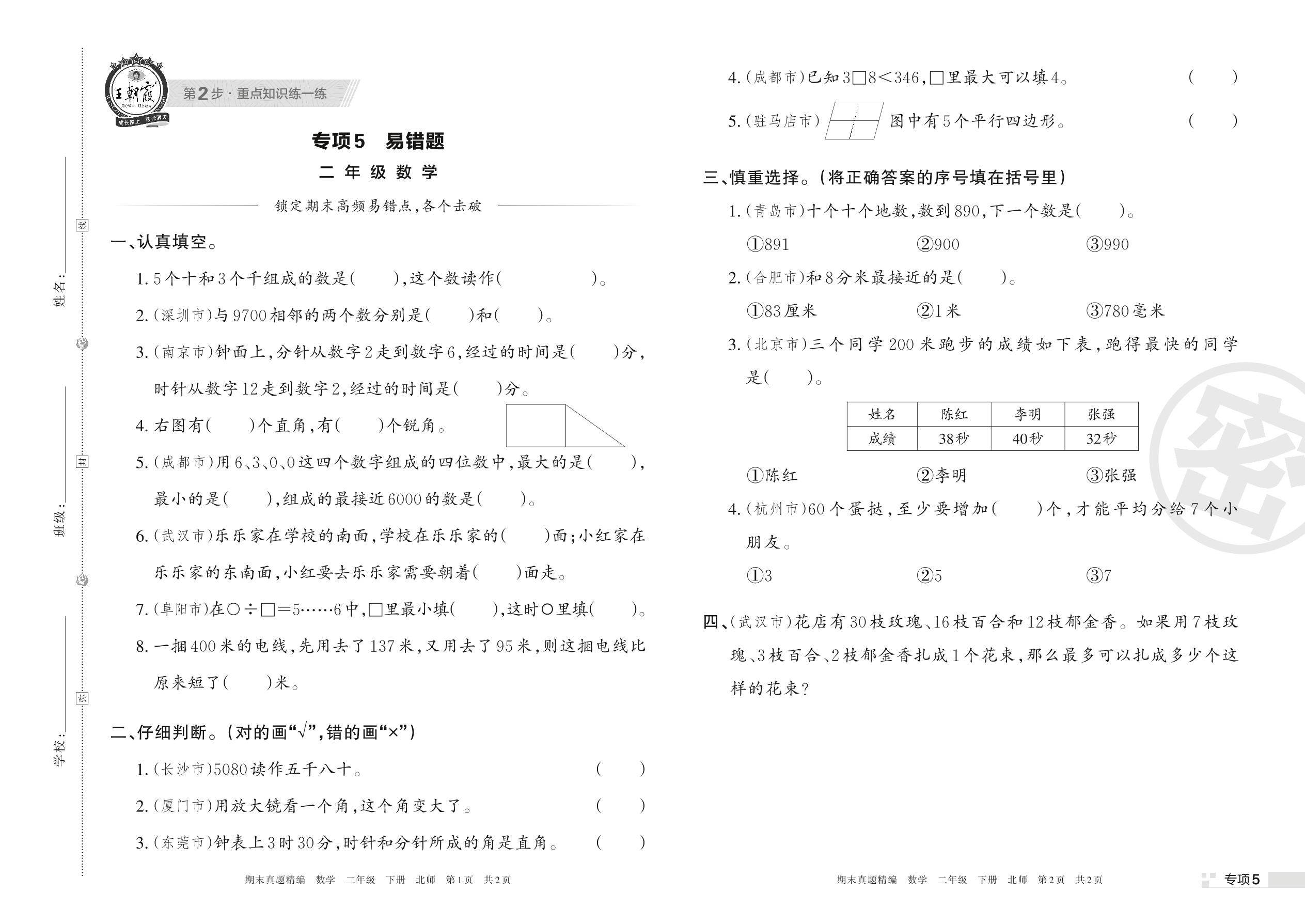 王朝霞期末专项卷——易错题二年级下册数学(北师版)_R220411162748381【5】