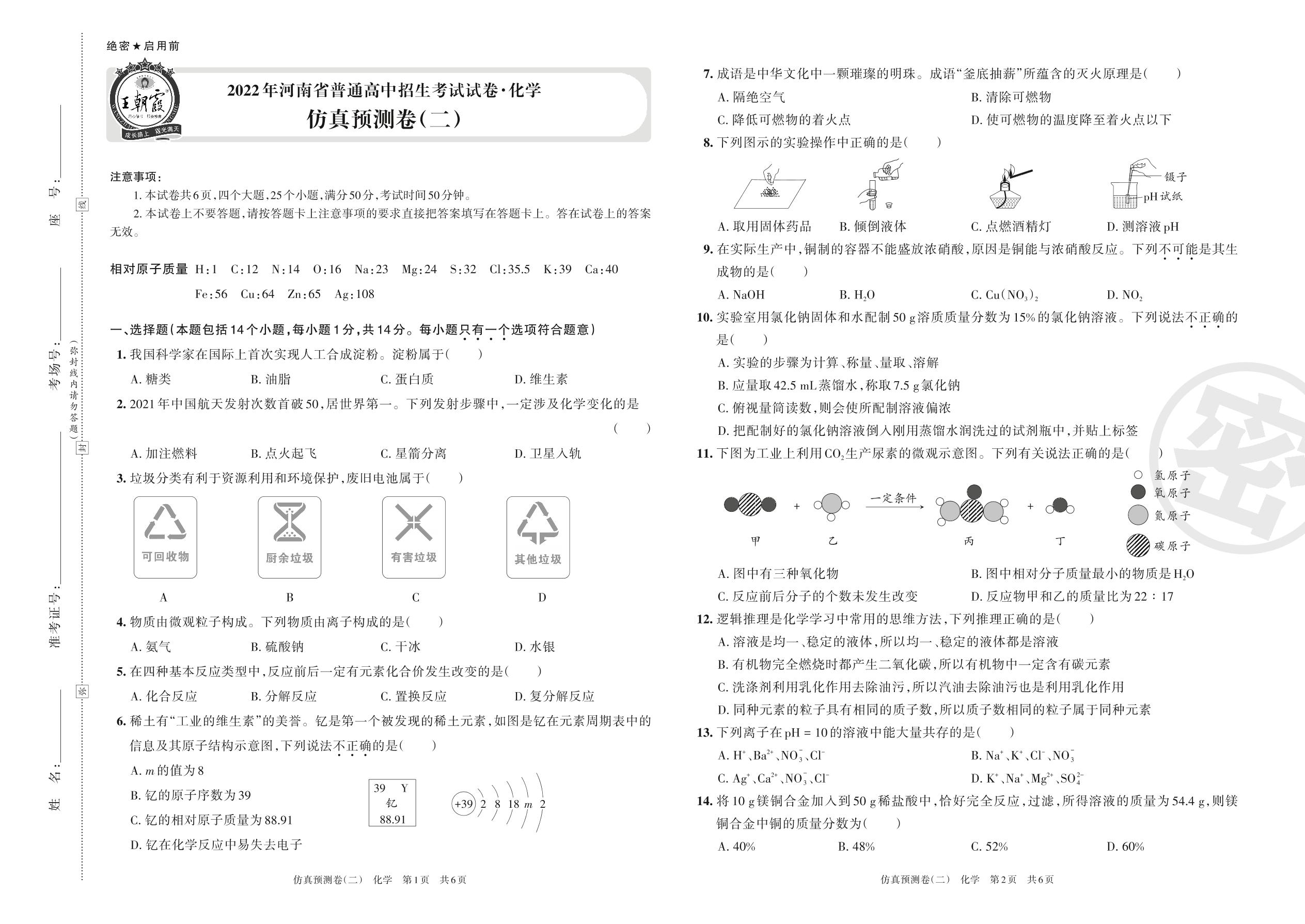 2022年河南省普通高中招生考试试卷·化学仿真预测卷(二)