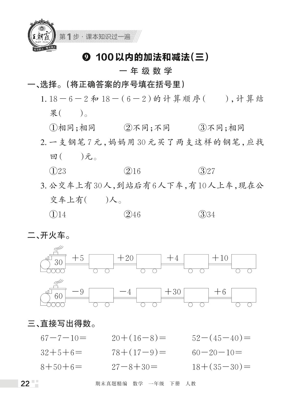 王朝霞期末过课本——9 100以内的加法和减法(三)一年级下册数学(人教版)_R220411163459788
