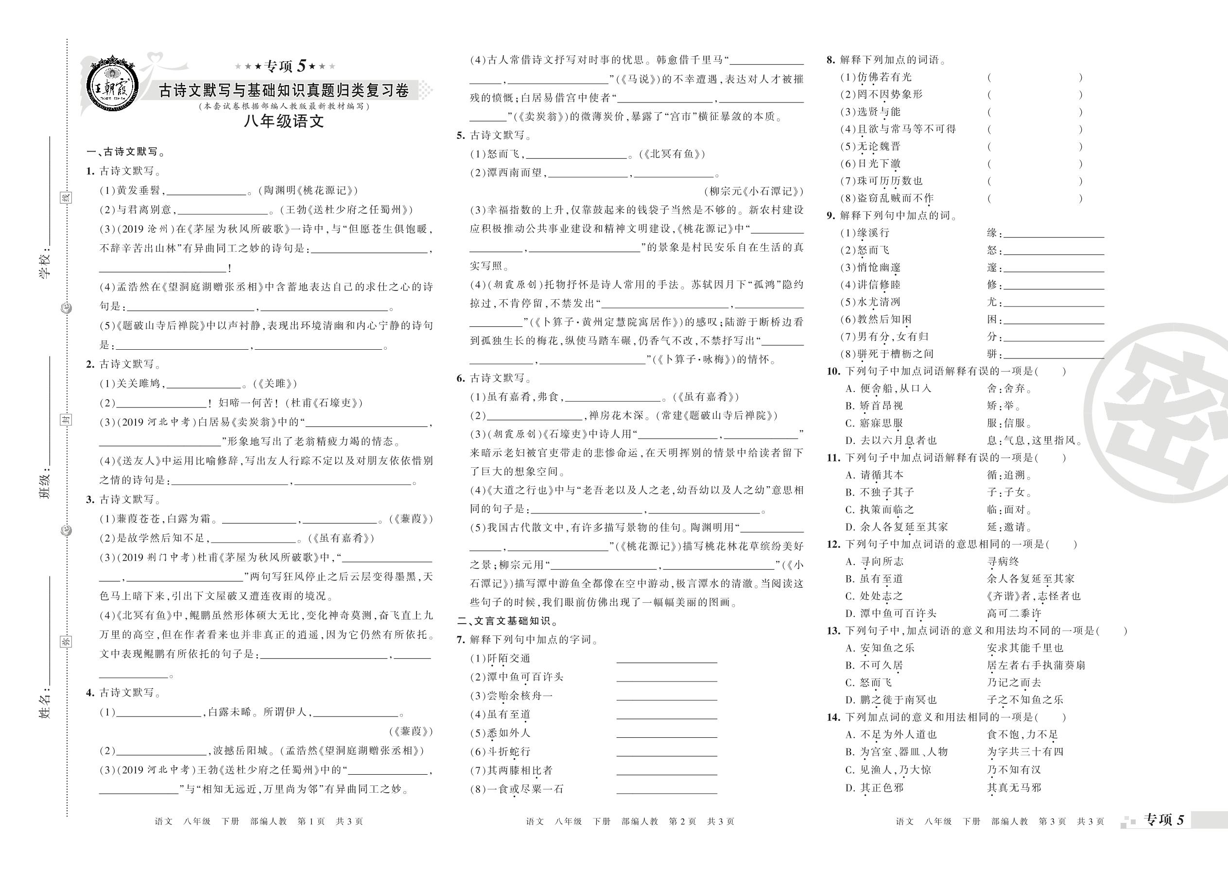 王朝霞期末专项卷——古诗文默写与基础知识、课内文言文阅读真题归类复习卷八年级下册语文(人教版)_R21080223643【0】