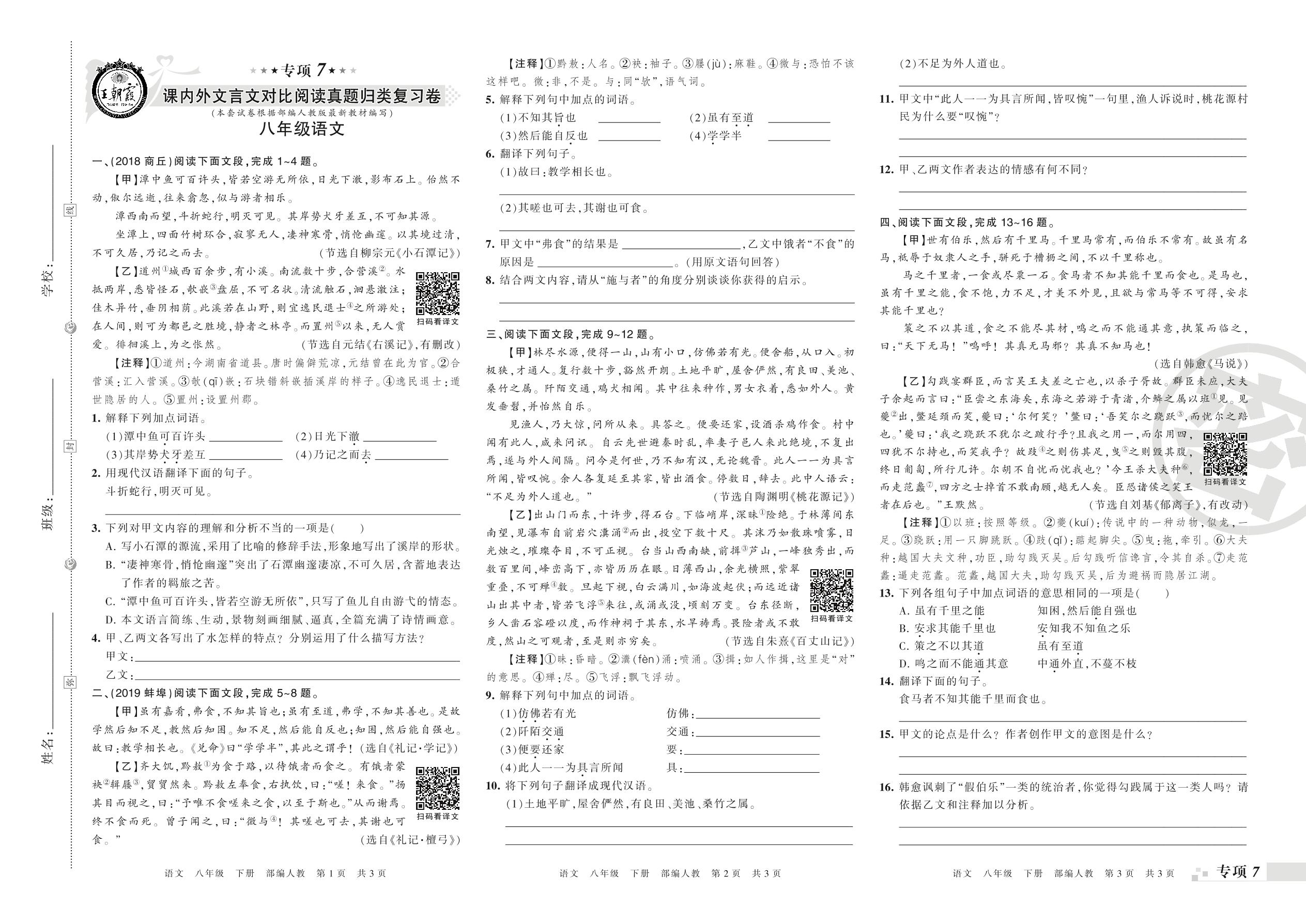 王朝霞期末专项卷——课内外文言文对比阅读、古诗词阅读真题归类复习卷八年级下册语文(人教版)_R21080223651【0】