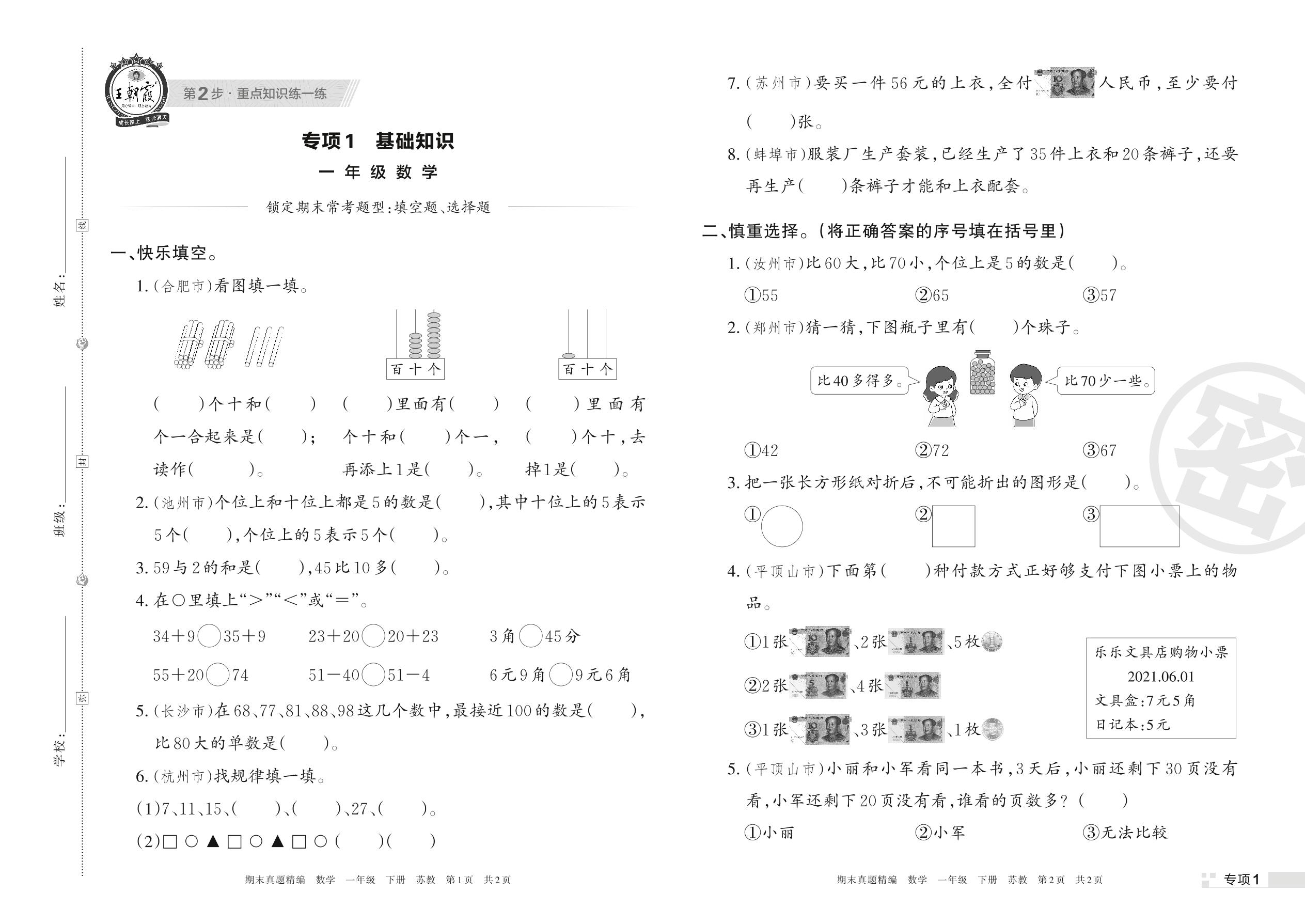 王朝霞期末专项卷——基础知识一年级下册数学(苏教版)【1】