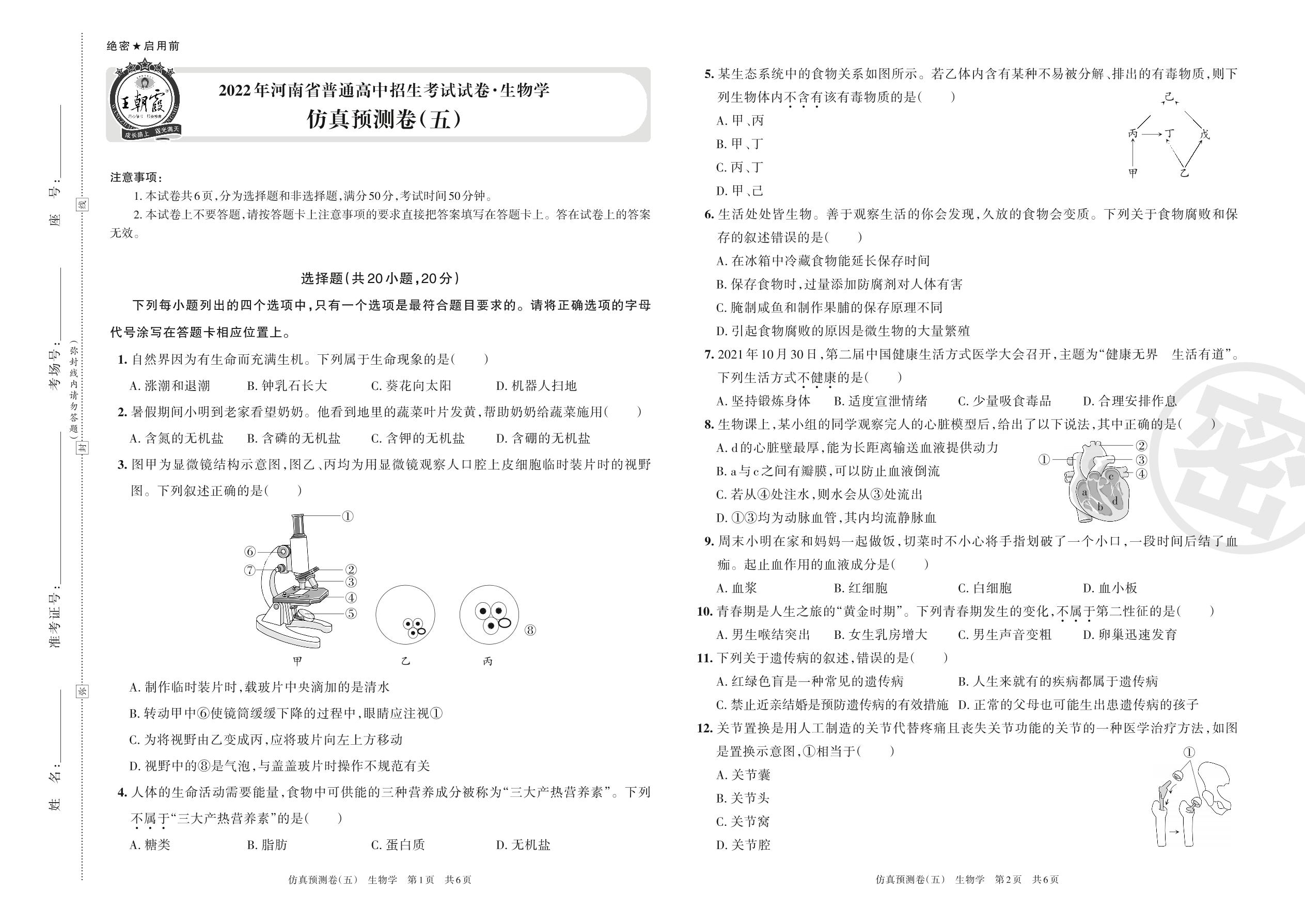 2022年河南省普通高中招生考试试卷·生物仿真预测卷(五)