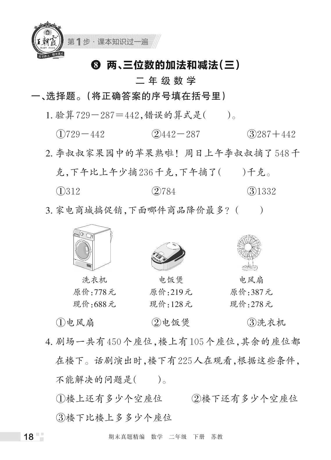 王朝霞期末过课本——8 两、三位数的加法和减法(三)二年级下册数学(苏教版)_R220411165838853