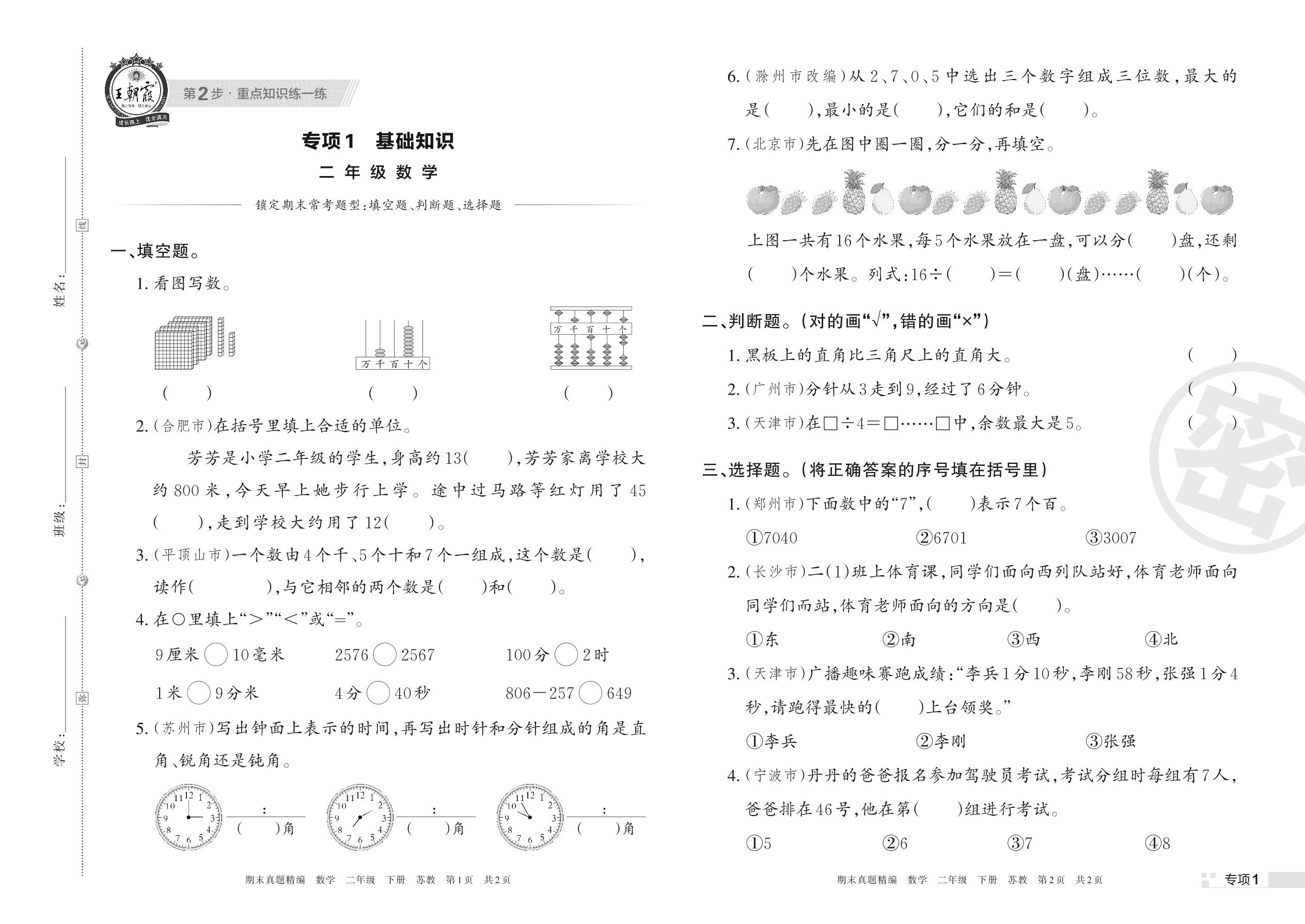 王朝霞期末专项卷——基础知识二年级下册数学(苏教版)【1】