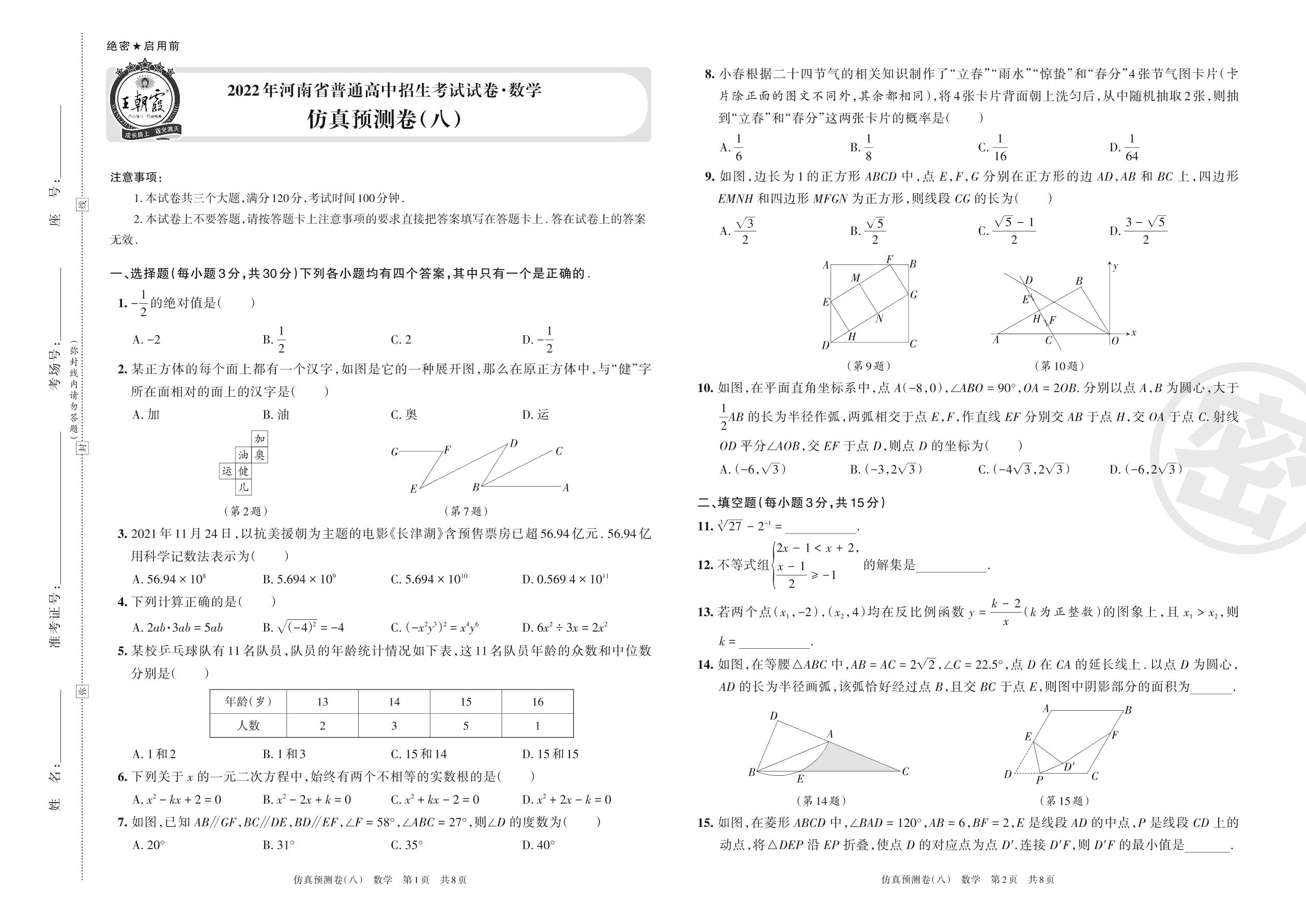 2022年河南省普通高中招生考试试卷·数学仿真预测卷(八)