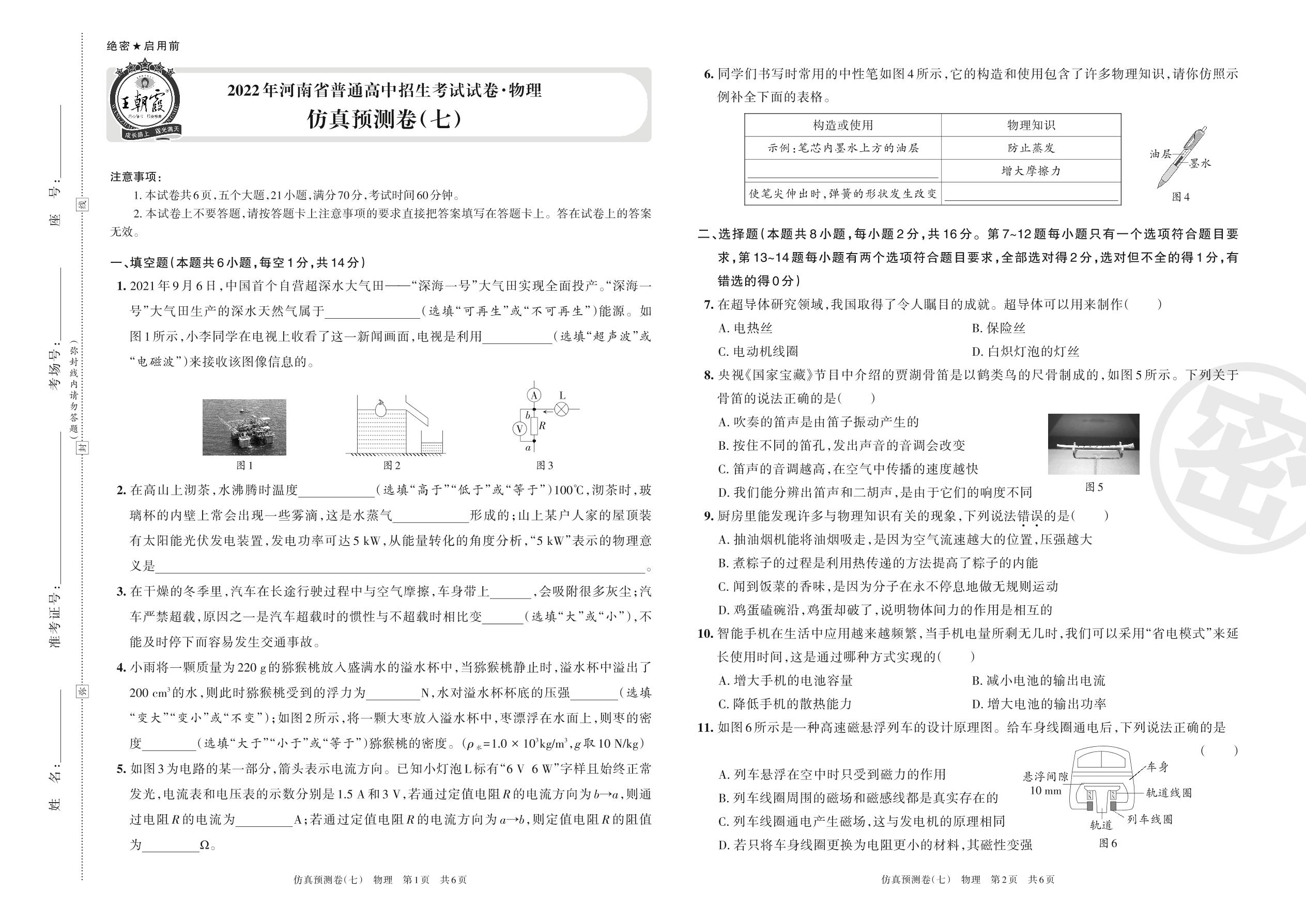 2022年河南省普通高中招生考试试卷·物理仿真预测卷(七)