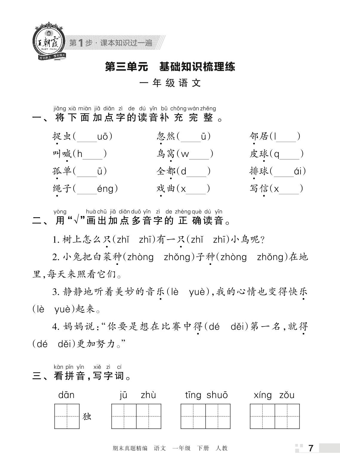 王朝霞期末过课本——第三单元 基础知识梳理练一年级下册语文(人教版)_R220411170430145