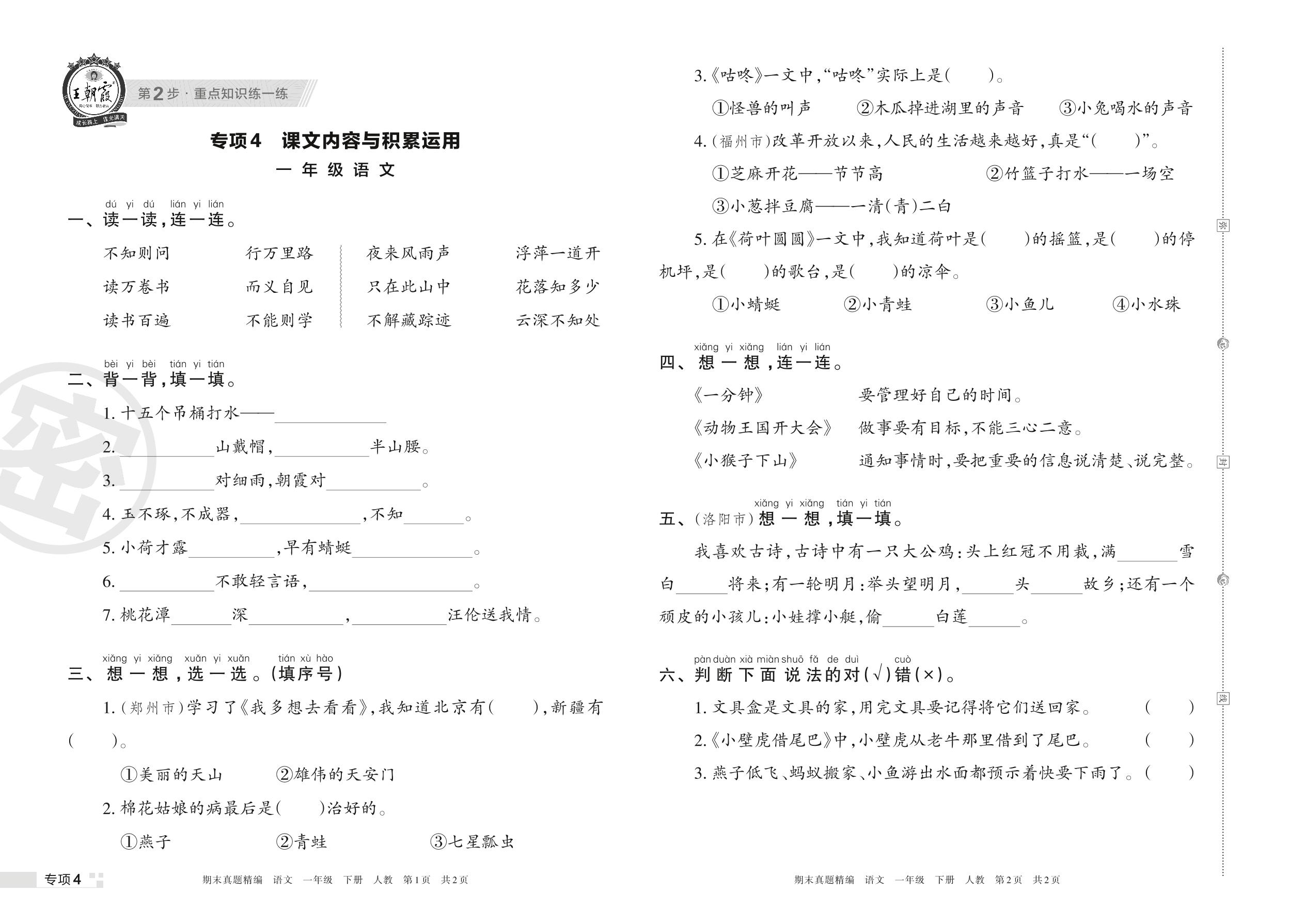 王朝霞期末专项卷——课文内容与积累运用一年级下册语文(人教版)_R220411170430660【4】