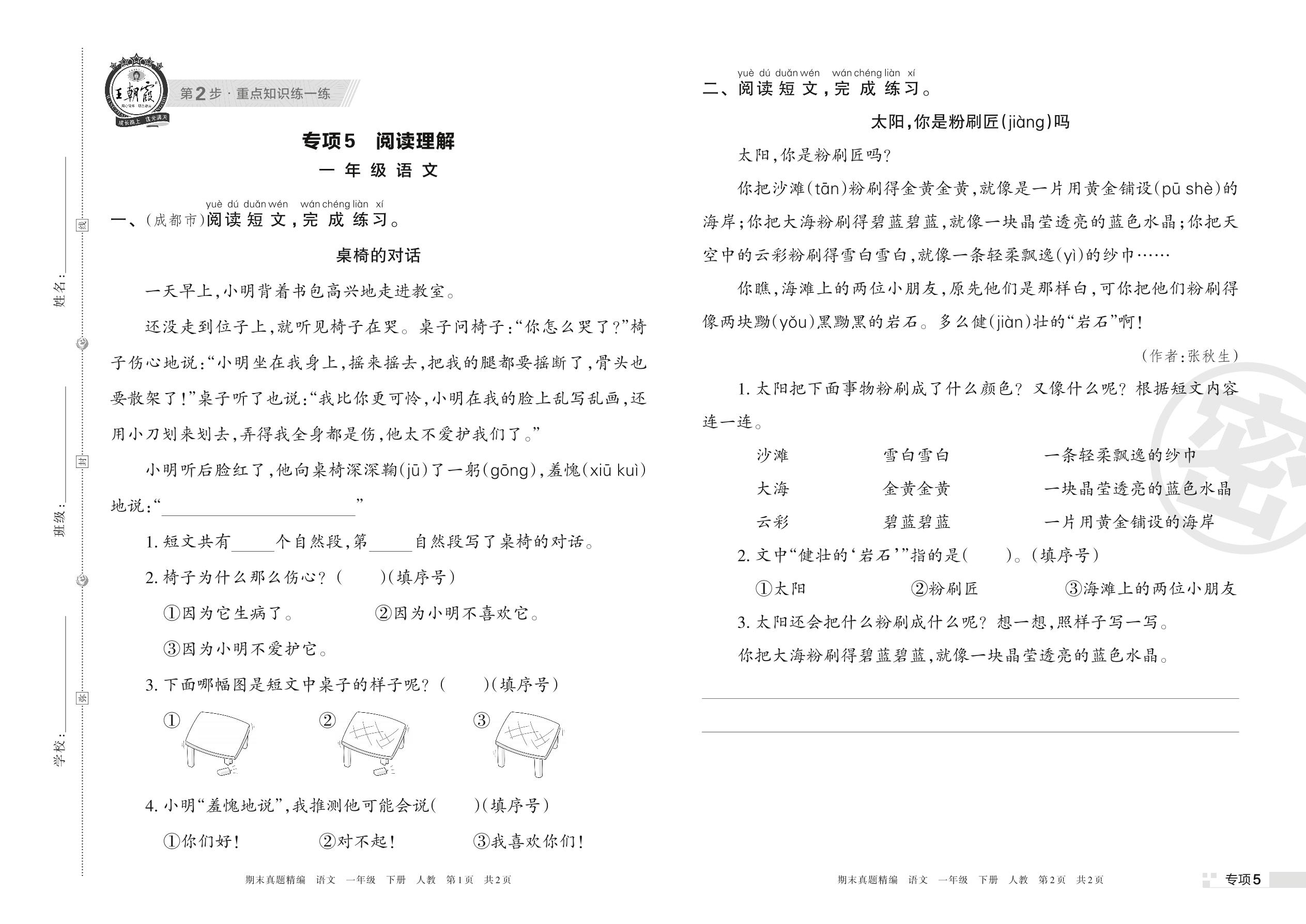 王朝霞期末专项卷——阅读理解一年级下册语文(人教版)_R220411170430692【5】