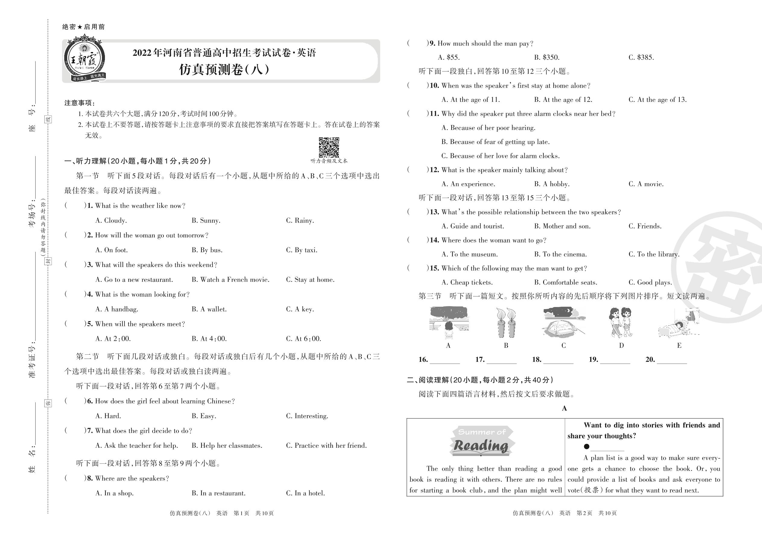 2022年河南省普通高中招生考试试卷·英语仿真预测卷(八)