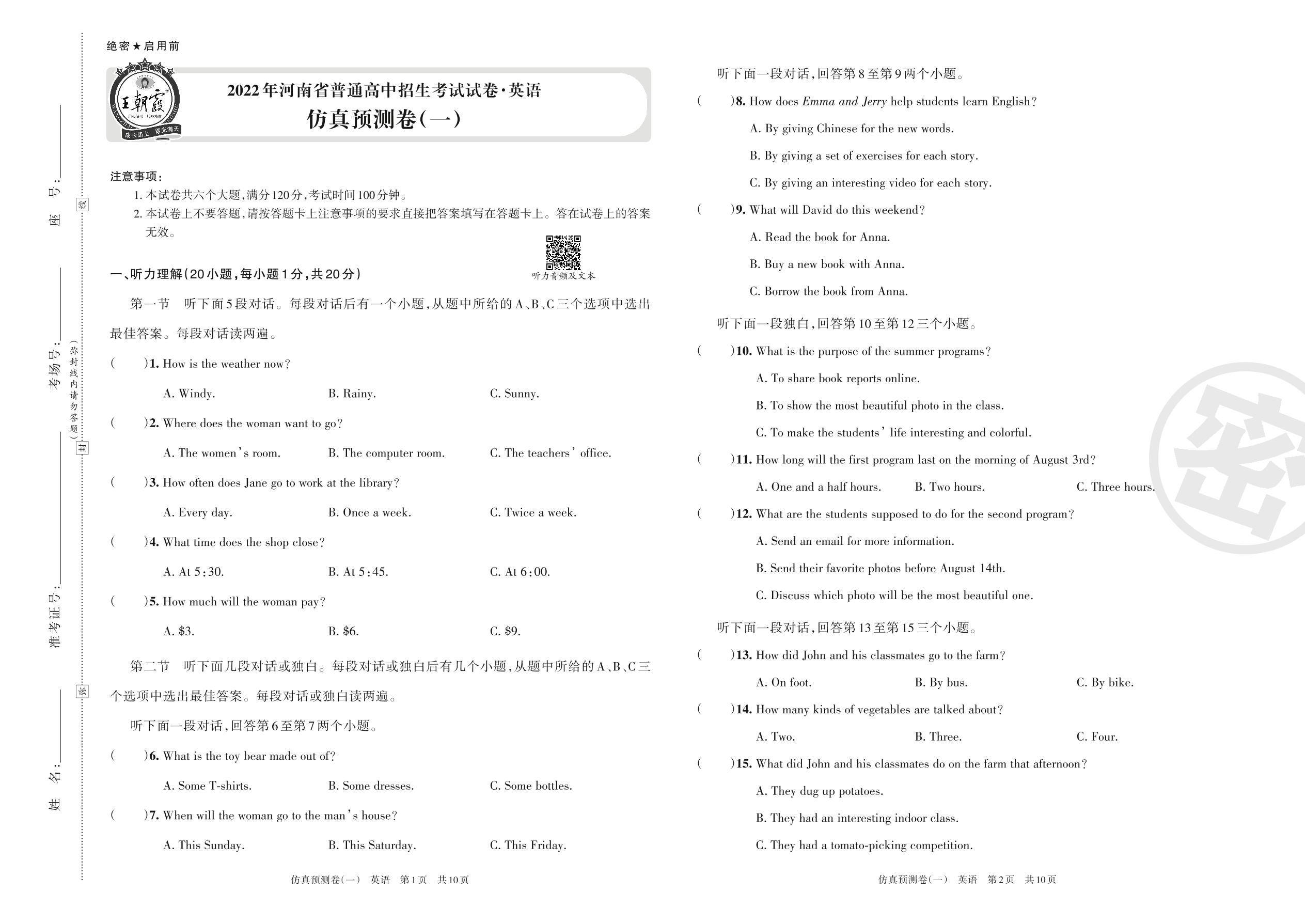 2022年河南省普通高中招生考试试卷·英语仿真预测卷(一)