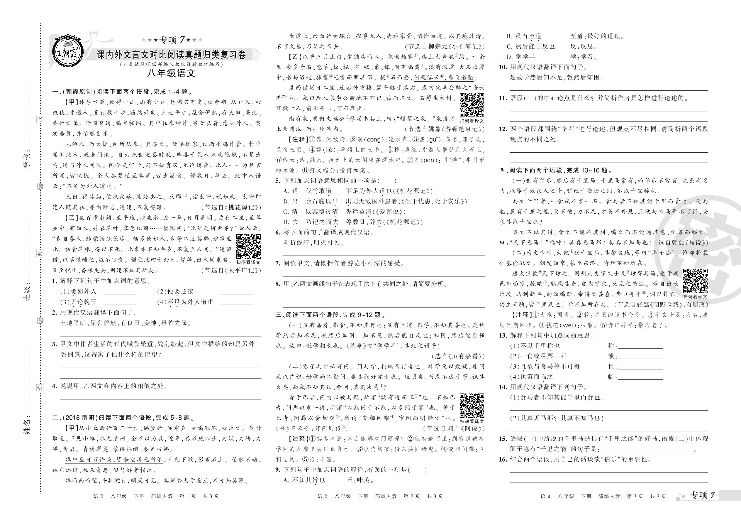 王朝霞期末专项卷——课内外文言文对比阅读、古诗词阅读真题归类复习卷八年级下册语文(人教版)_R21080223847【0】