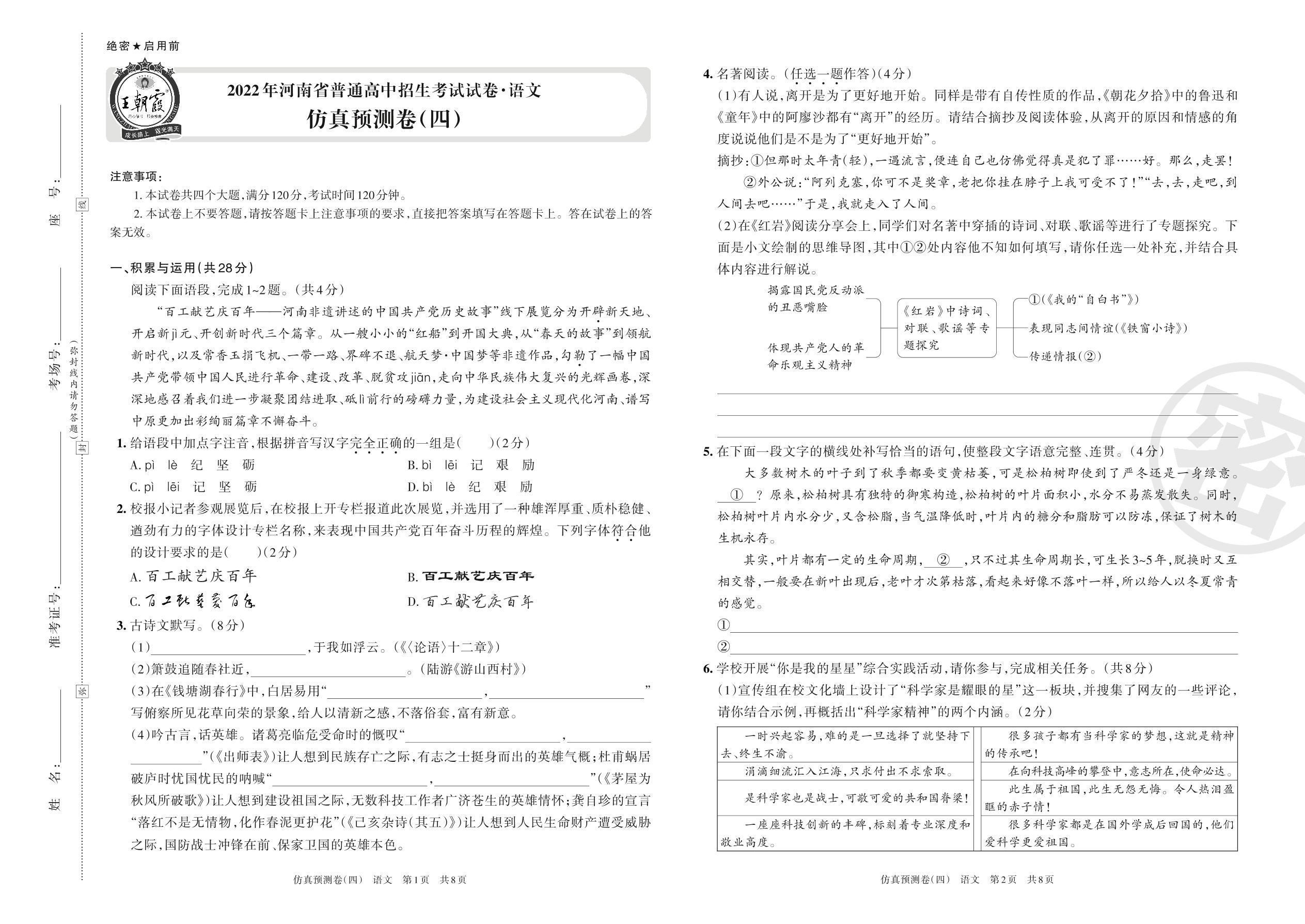 2022年河南省普通高中招生考试试卷·语文仿真预测卷(四)