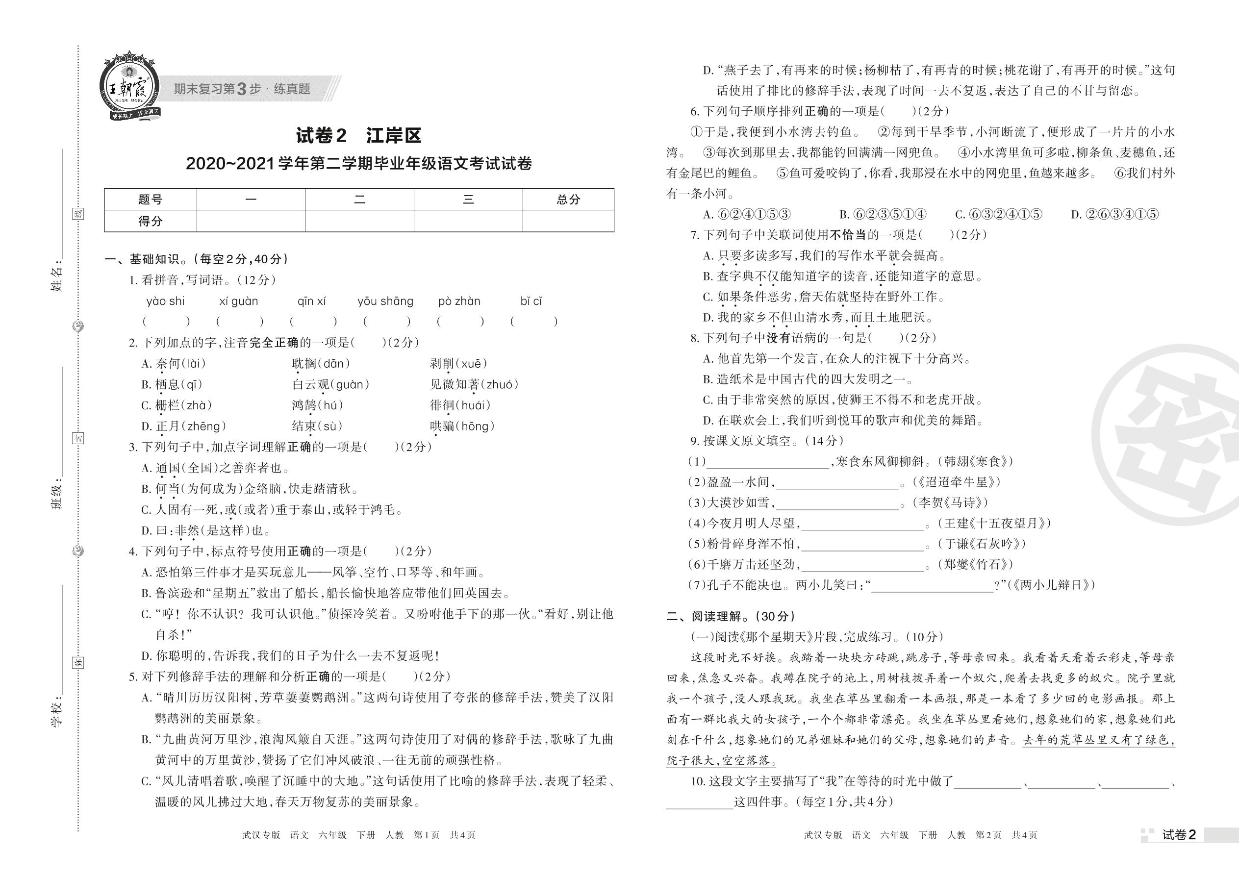 江岸区2020~2021学年第二学期毕业年级语文考试试卷(人教版)【2】