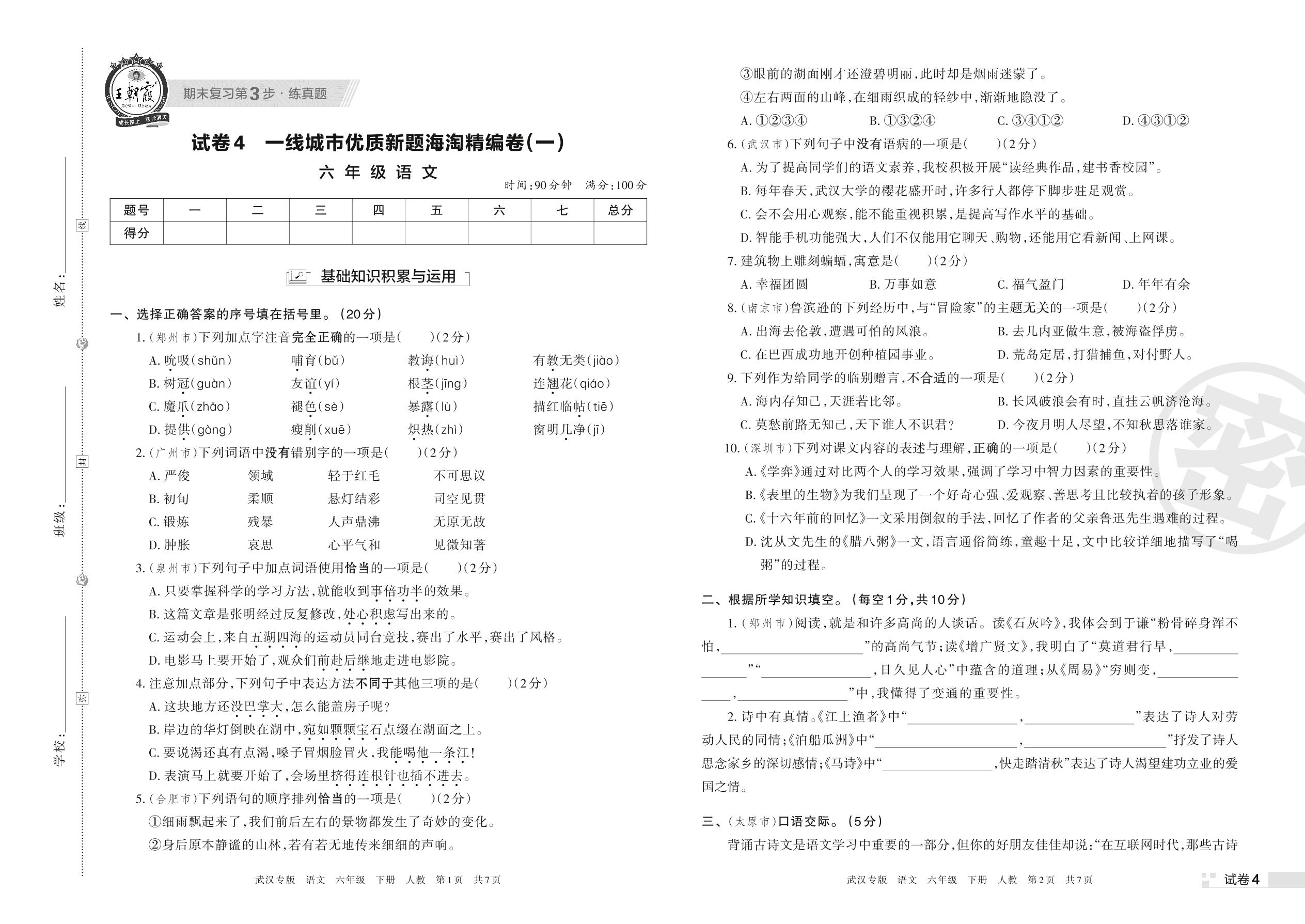 一线城市优质新题海淘精编卷(一)六年级下册语文(人教版)_R220412164746937【4】