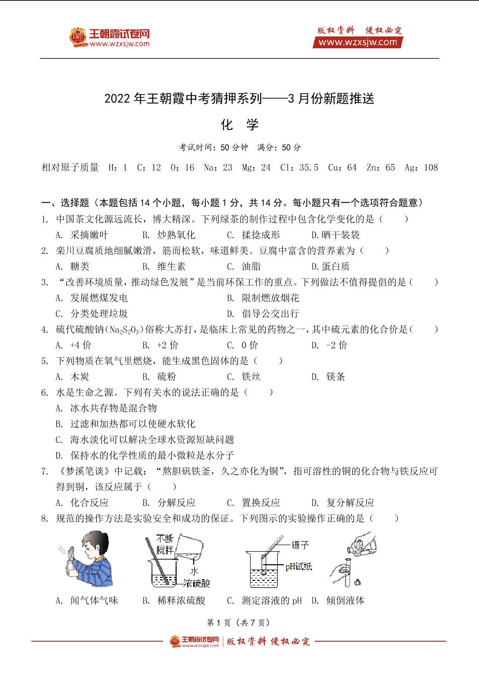 【化学】2022年王朝霞中考猜押系列——3月份新题推送