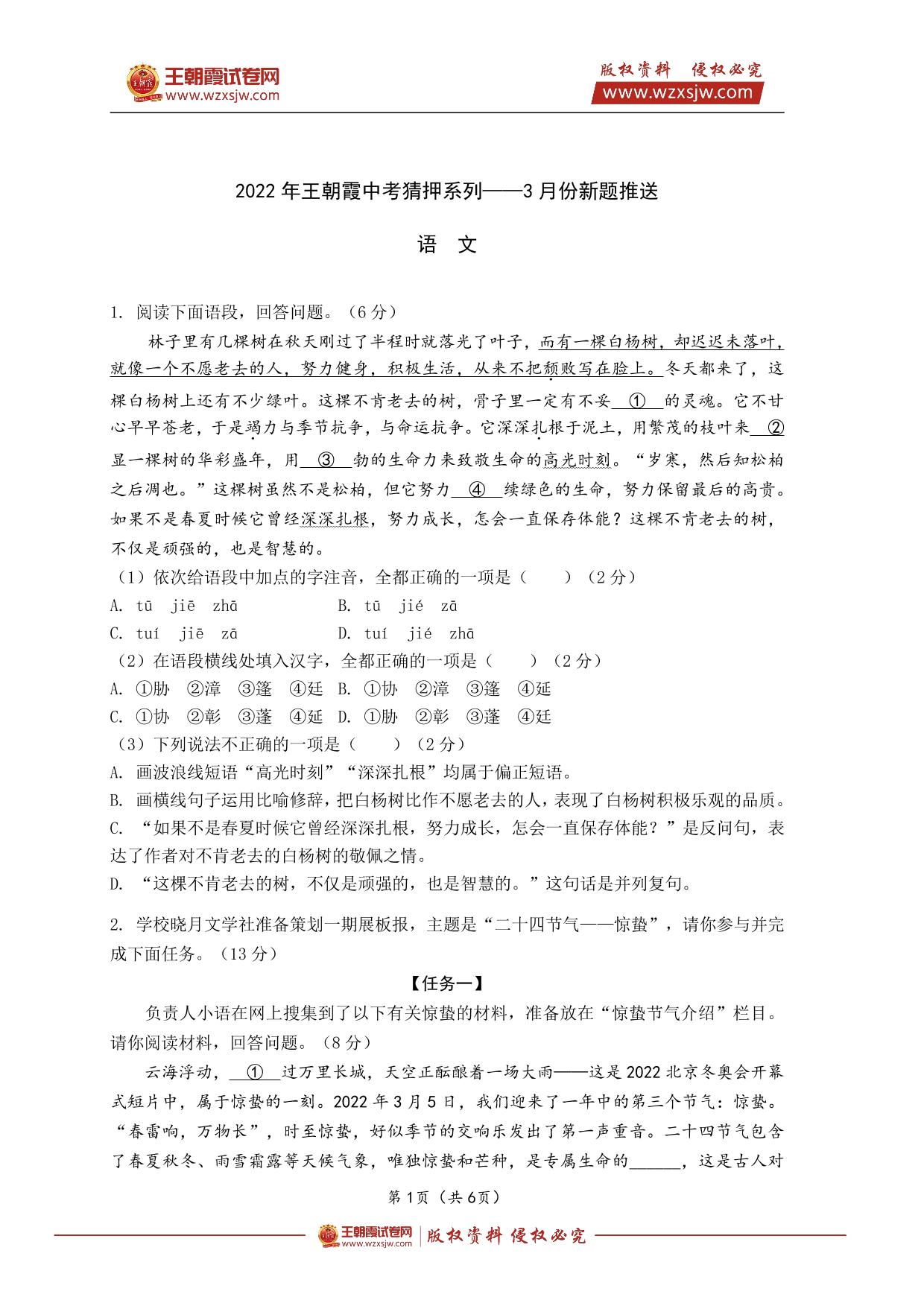 【语文】2022年王朝霞中考猜押系列——3月份新题推送