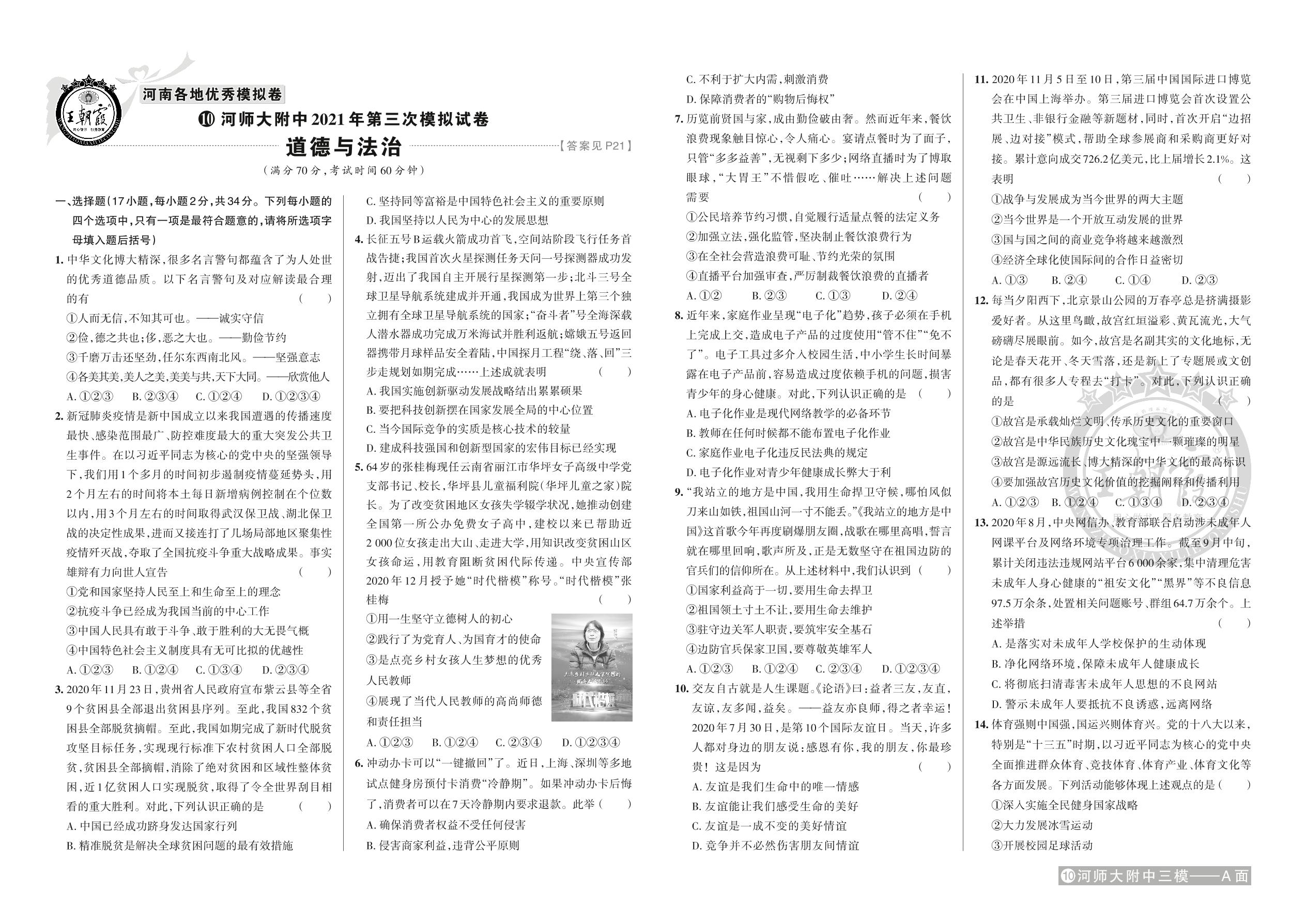 河师大附中2021年第三次模拟试卷·中考道德与法治【10】