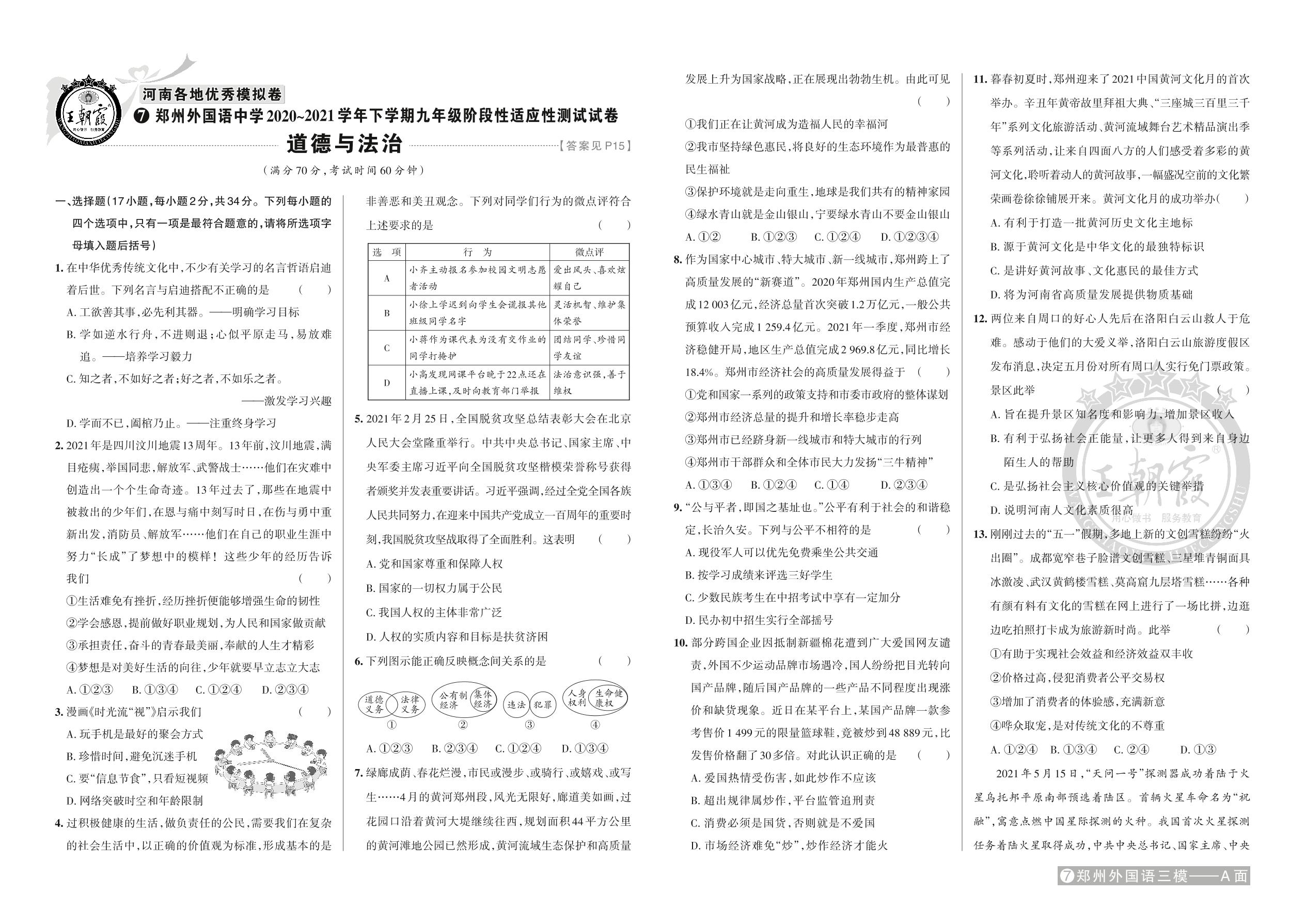 郑州外国语中学2020~2021学年下学期九年级阶段性适应性测试试卷·道德与法治【7】