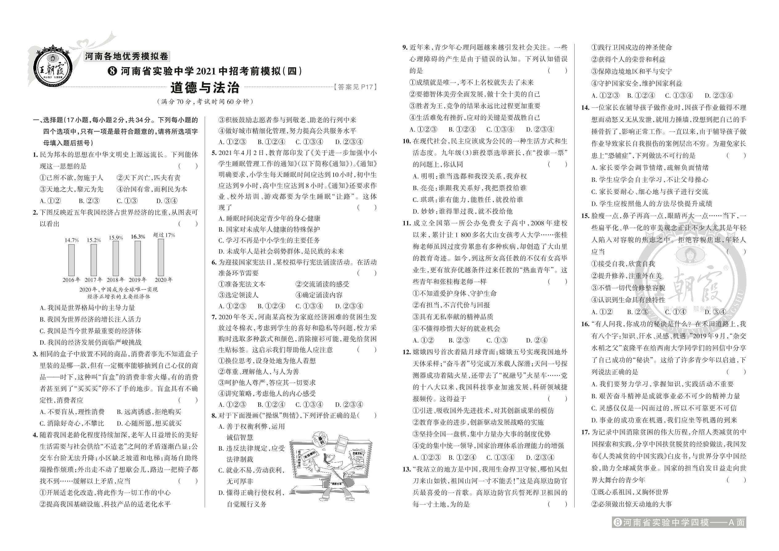 河南省实验中学2021中招考前模拟(四)·道德与法治【8】