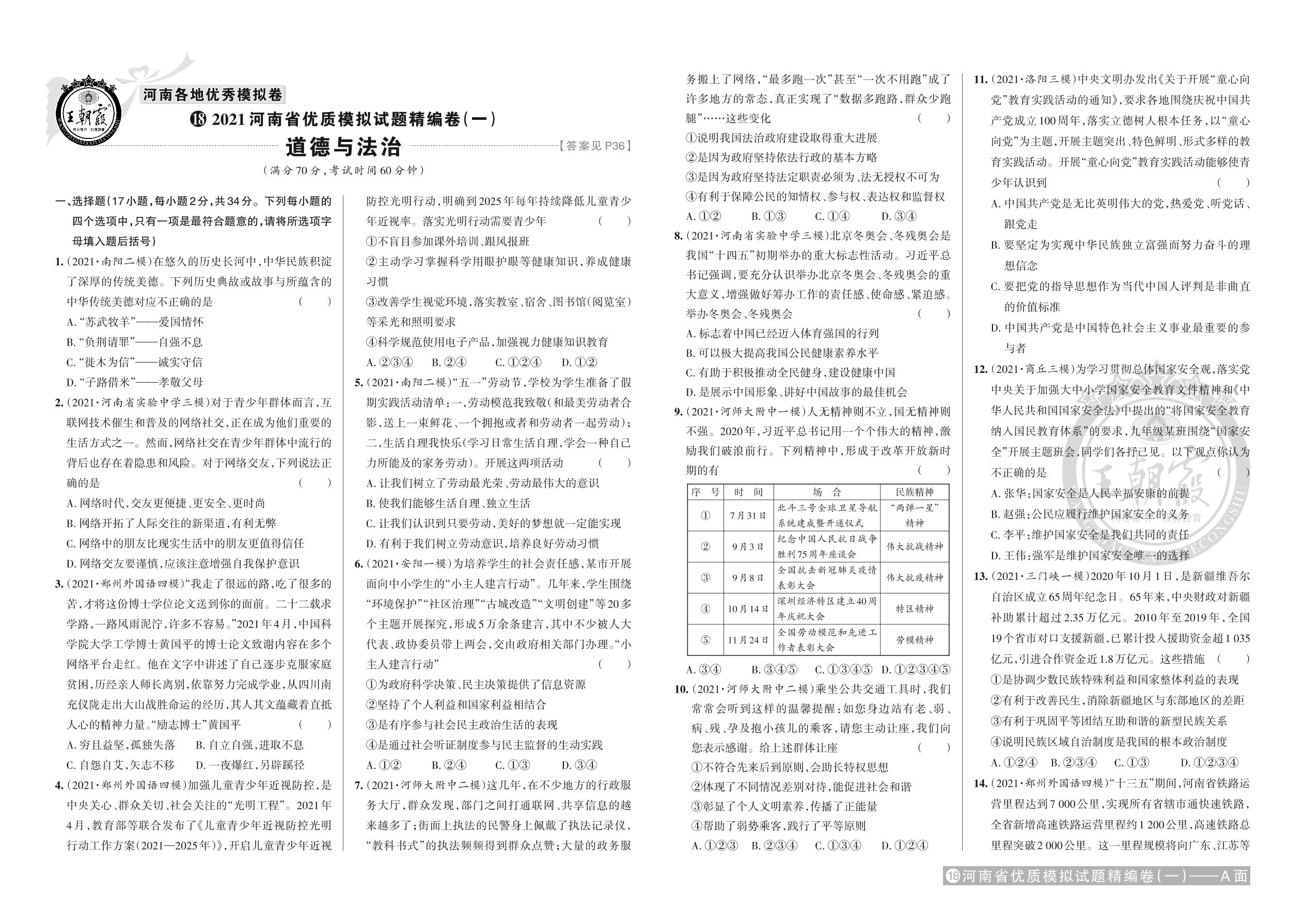 2021河南省优质模拟试题精编卷(一)·中考道德与法治【18】