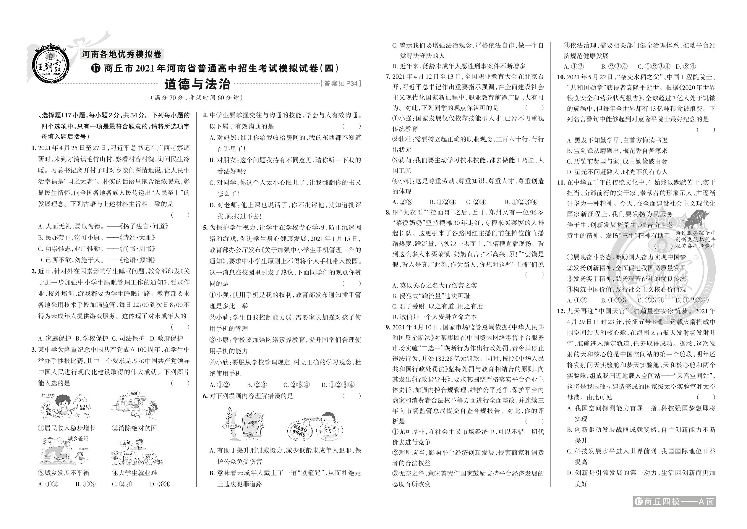 商丘市2021年河南省普通高中招生考试模拟试卷(四)·道德与法治【17】