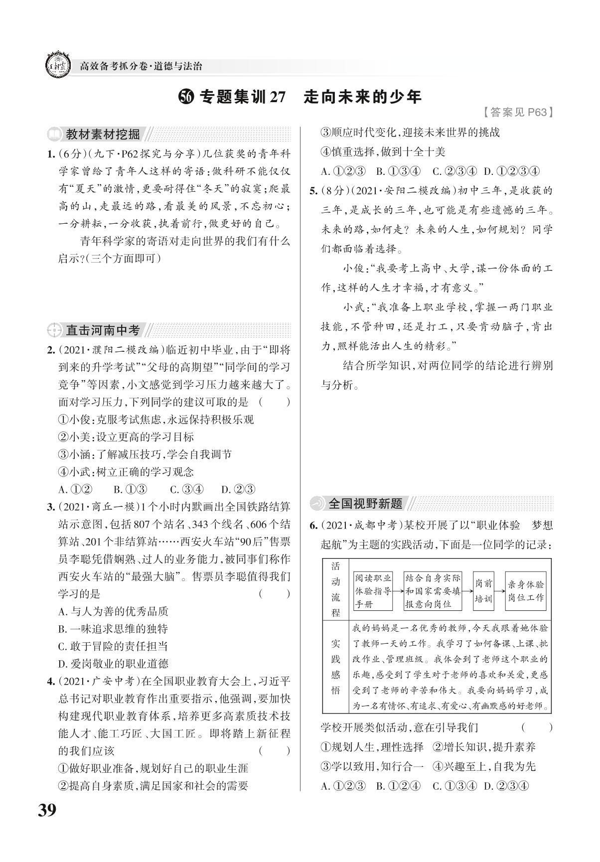 专题集训27 走向未来的少年·九年级下册道德与法治【56】