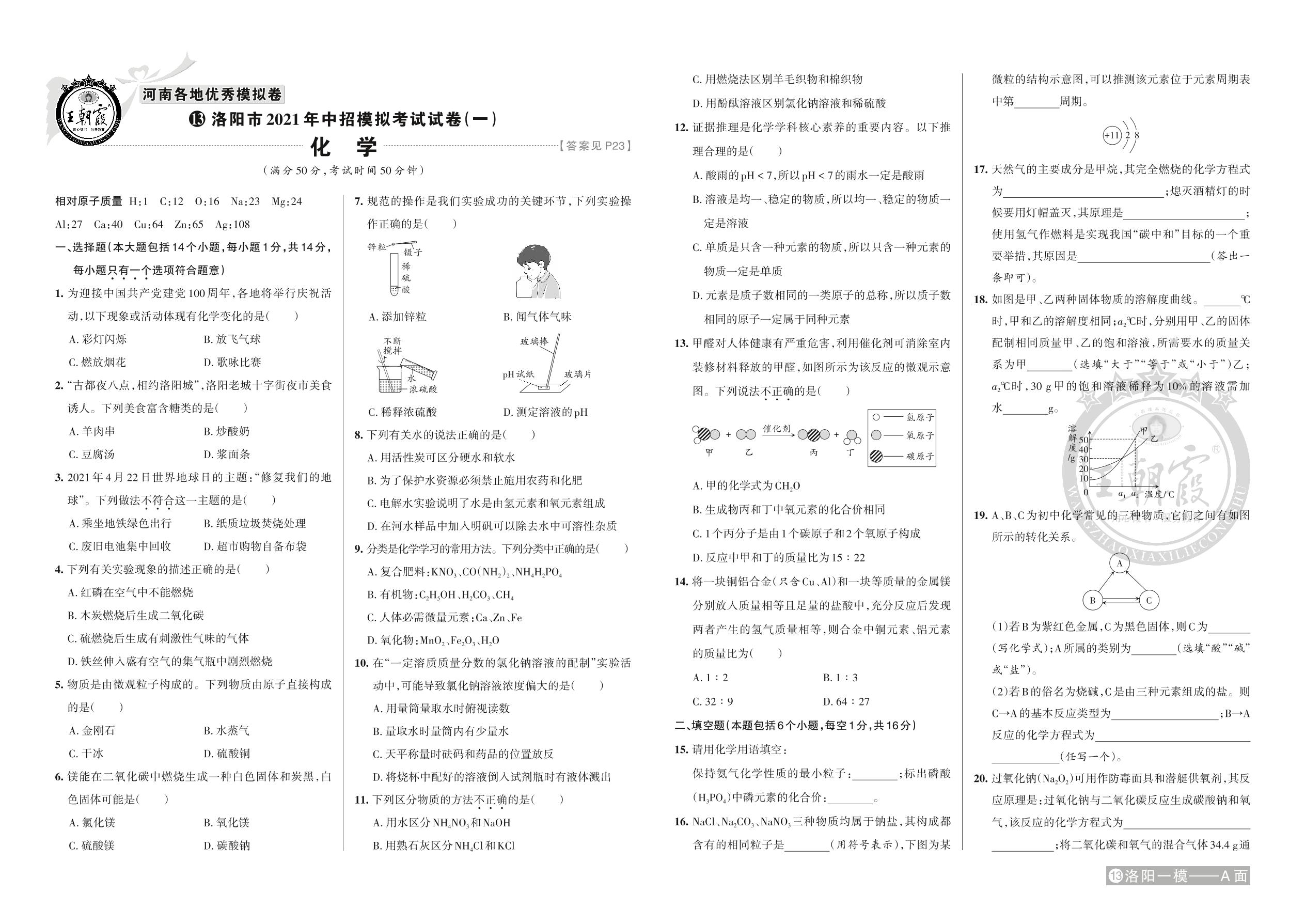 洛阳市2021年中招模拟考试试卷(一)·化学【13】