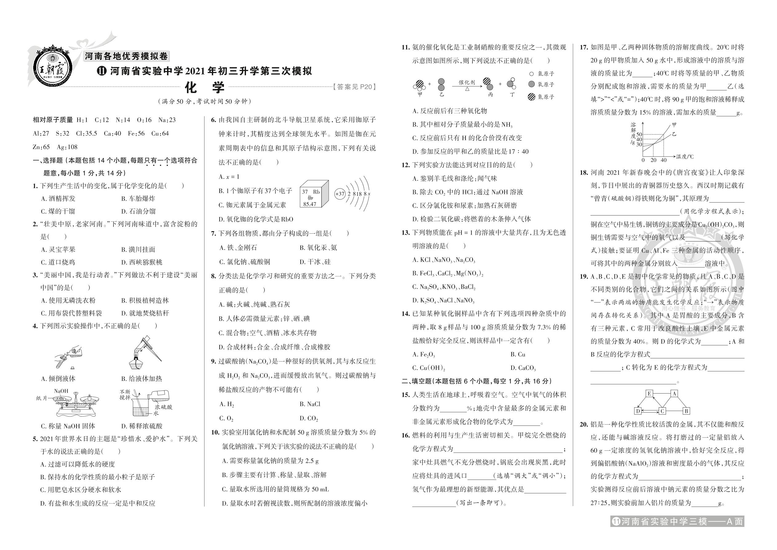 河南省实验中学2021年初三升学第三次模拟·化学【11】