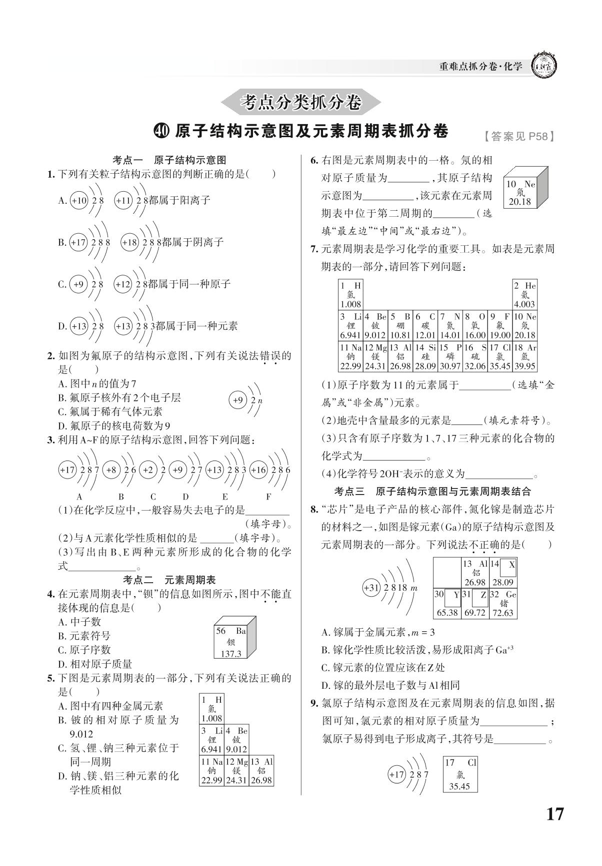 中考化学考点分类抓分卷——原子结构示意图及元素周期表抓分卷【40】