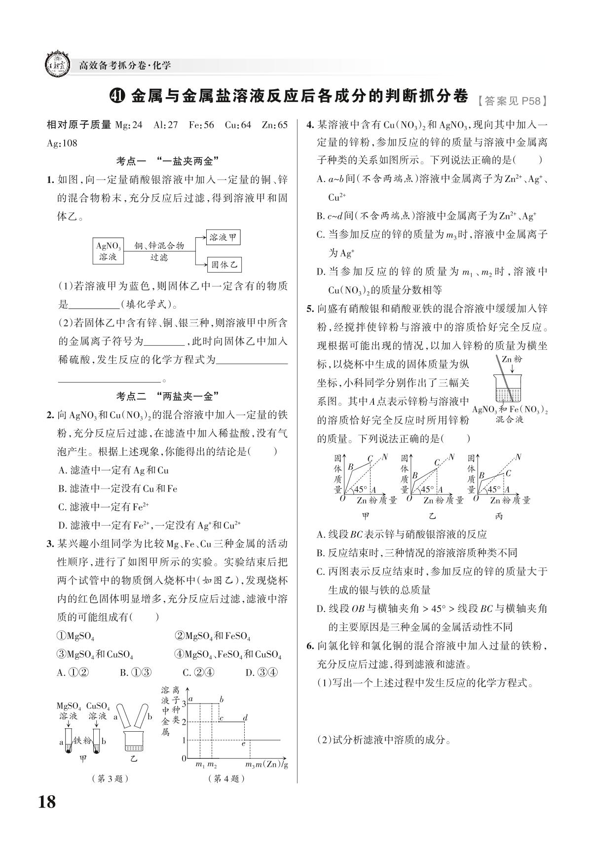 中考化学考点分类抓分卷——金属与金属盐溶液反应后各成分的判断抓分卷【41】