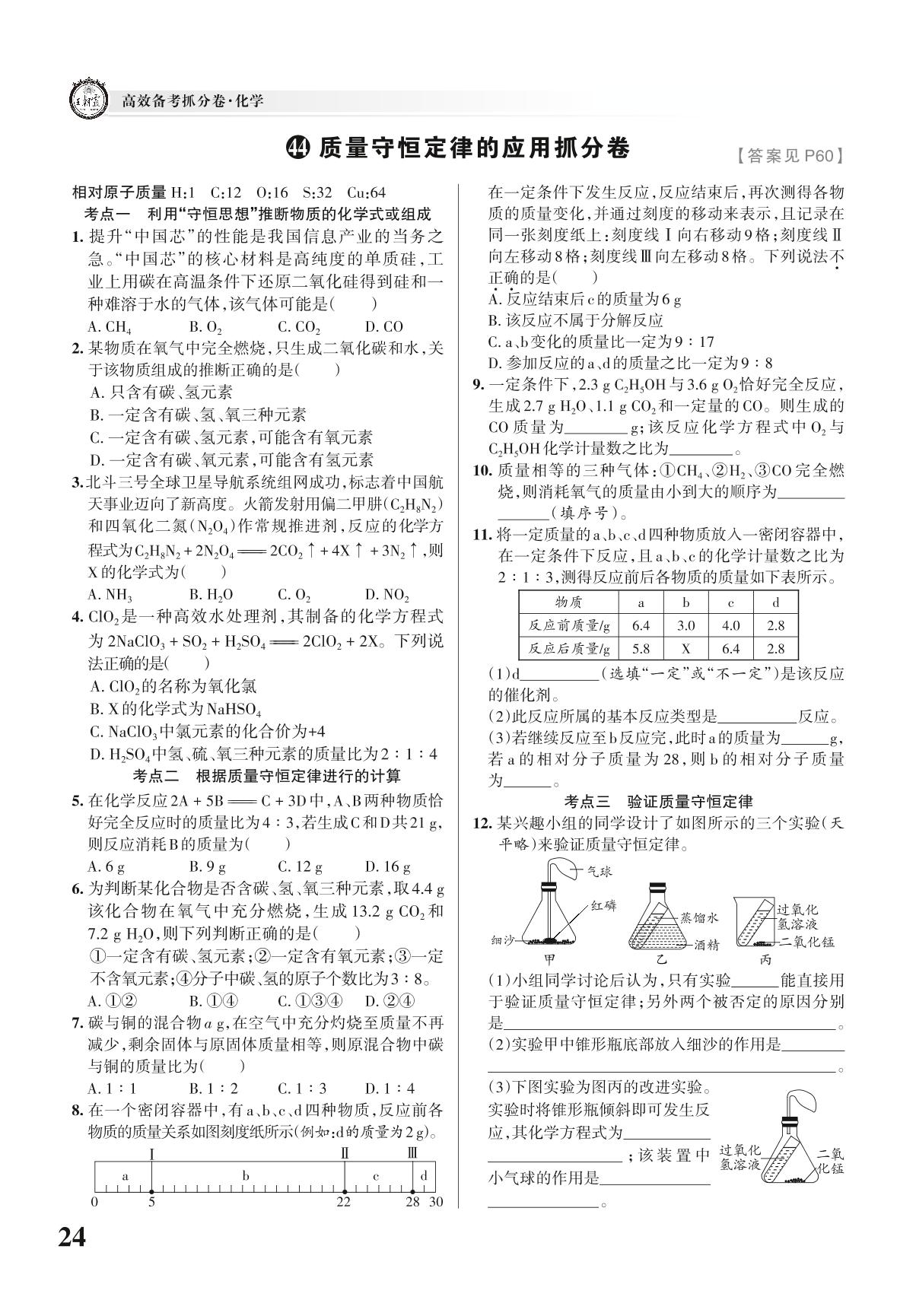 中考化学考点分类抓分卷——质量守恒定律的应用抓分卷【44】
