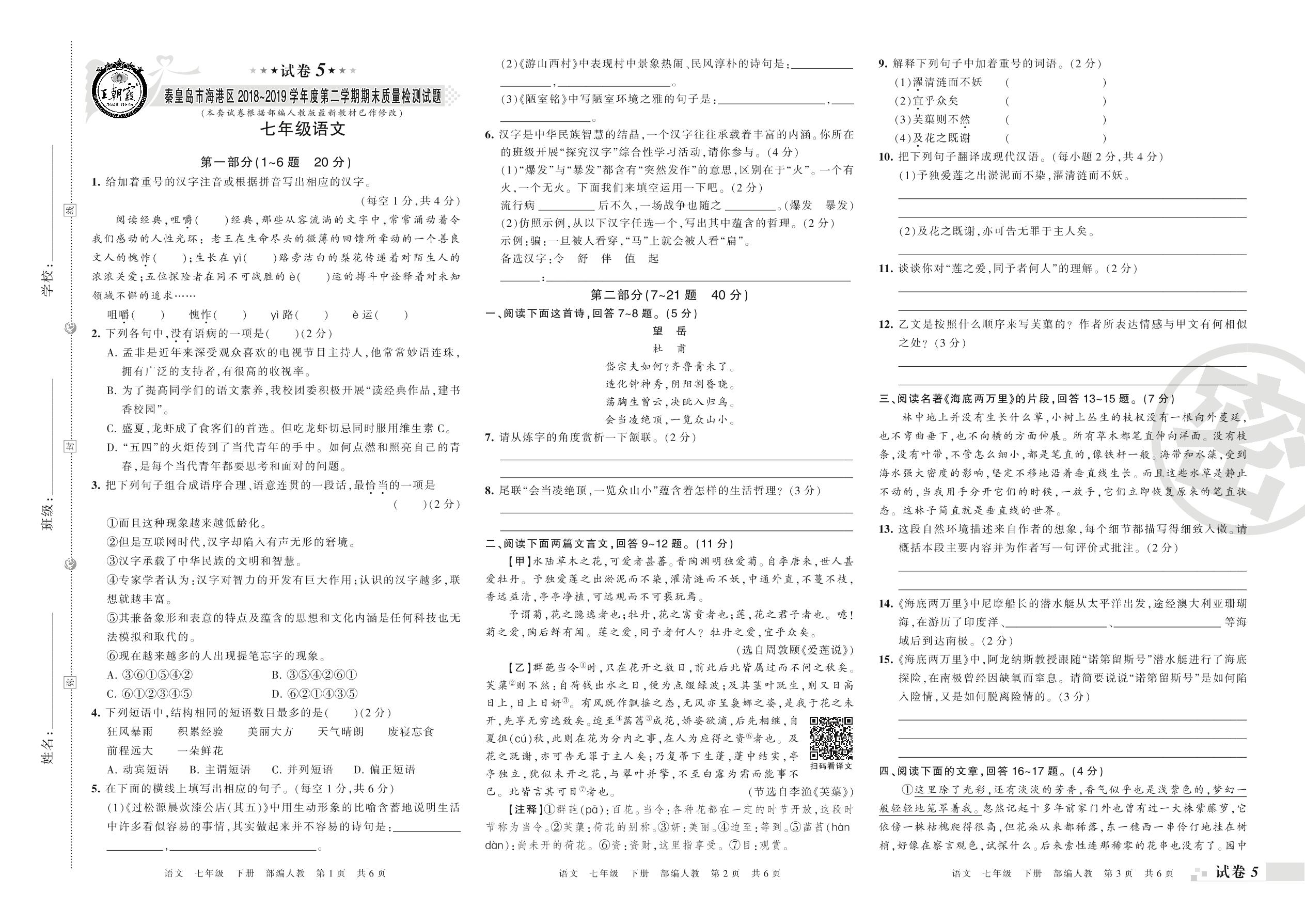 2018-2019学年第二学期秦皇岛市海港区七年级语文试卷(人教版)【5】