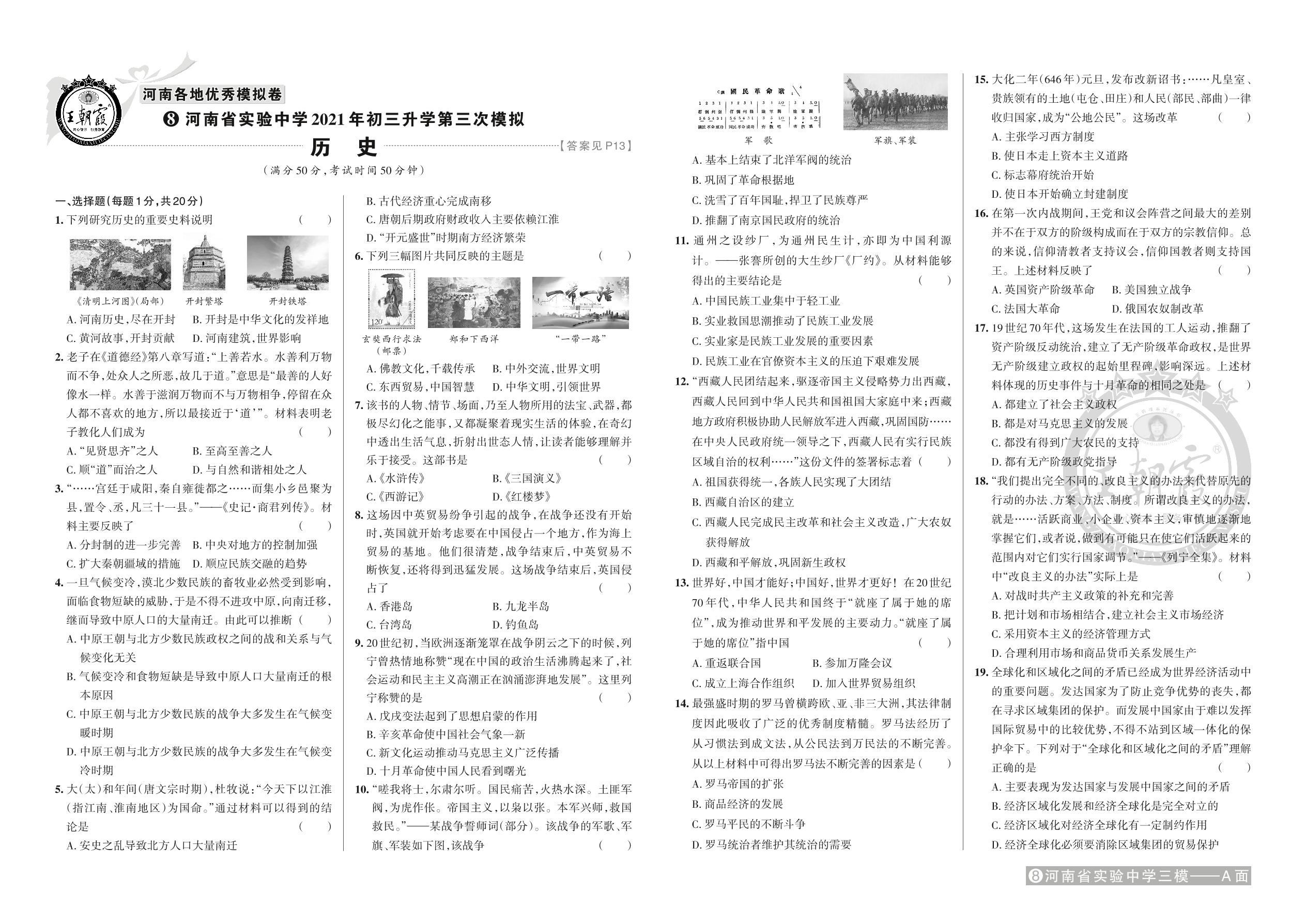 河南省实验中学2021年初三升学第三次模拟·历史【8】