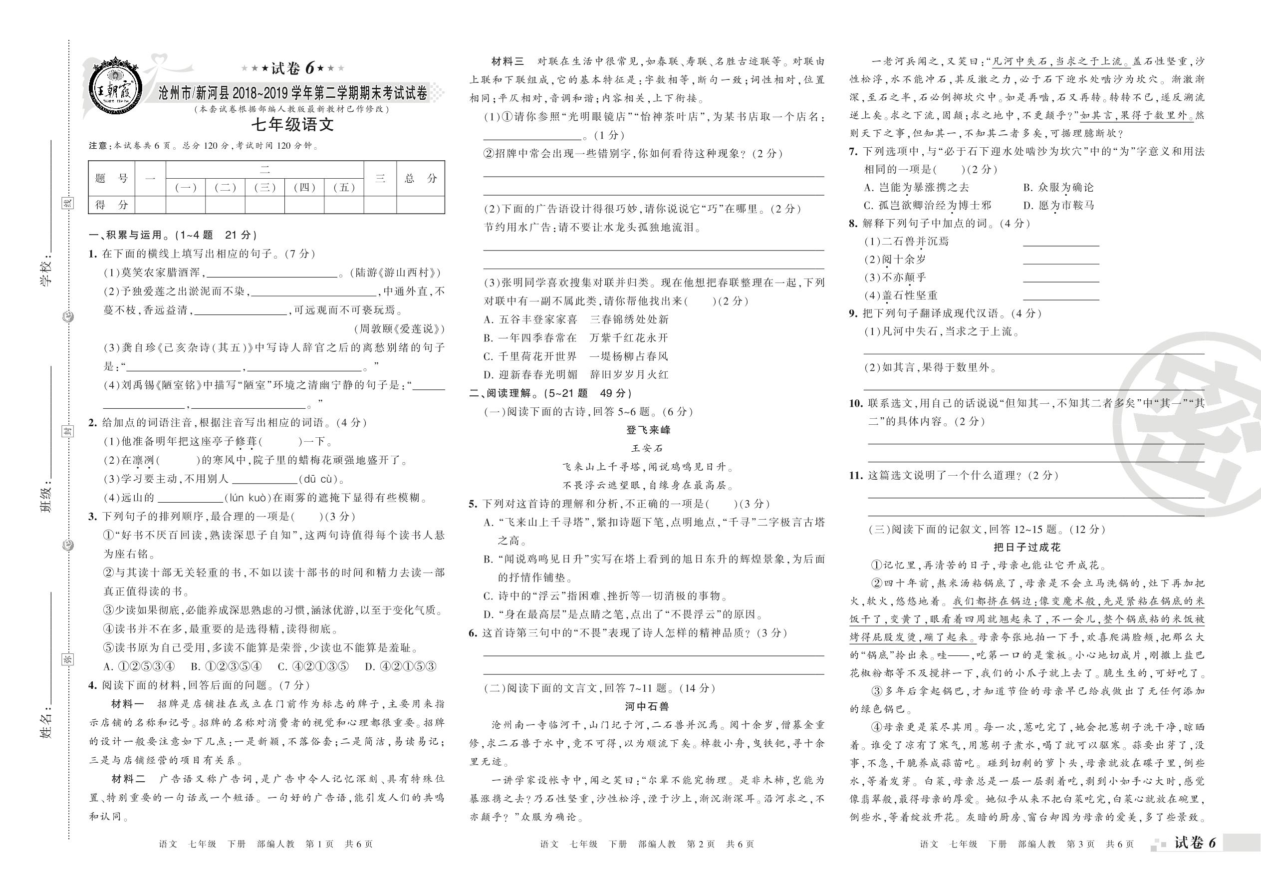 2018-2019学年第二学期沧州市、新河县七年级语文试卷(人教版)【6】
