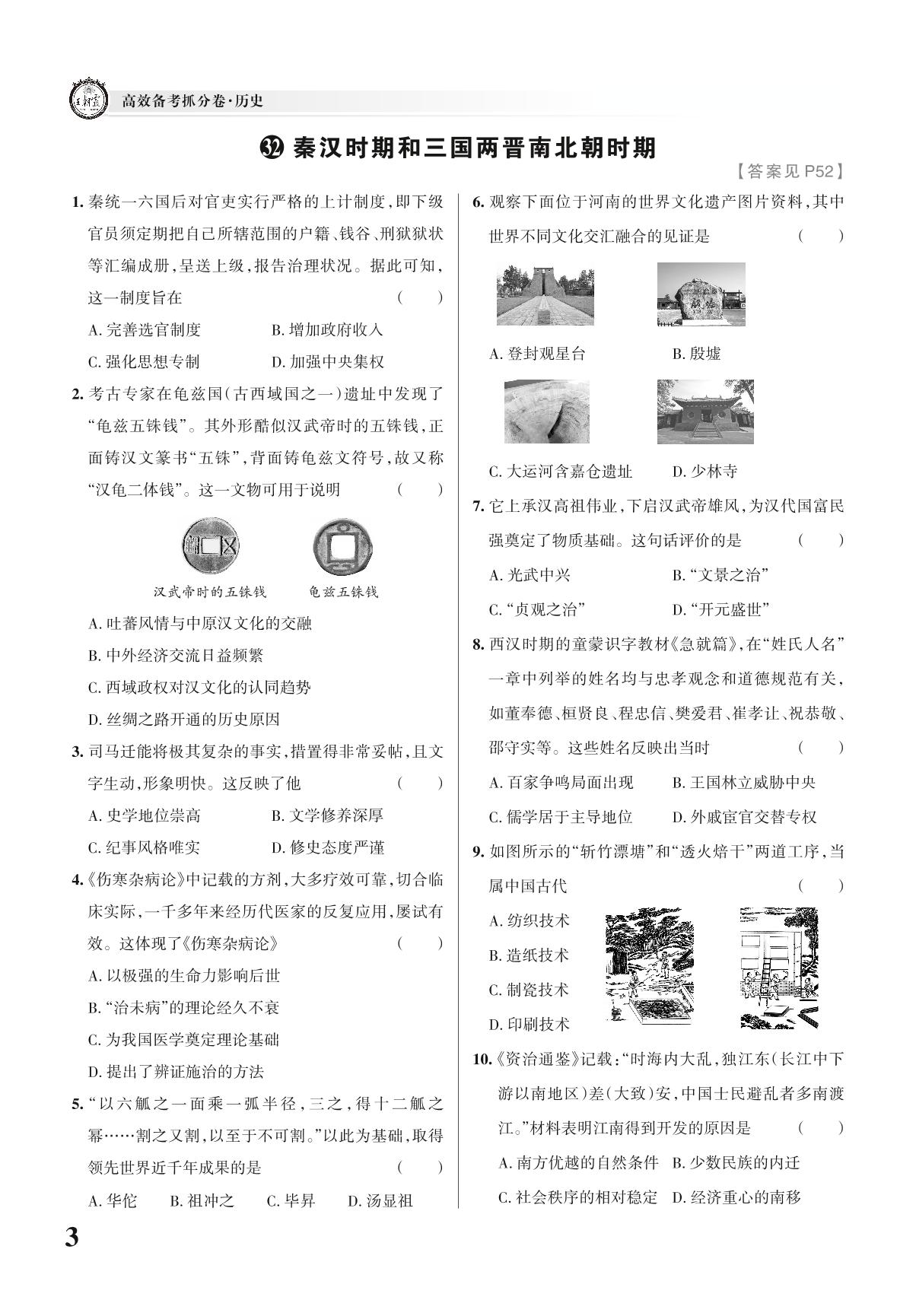 中考历史古代史选择题集训——秦汉时期和三国两晋南北朝时期【32】